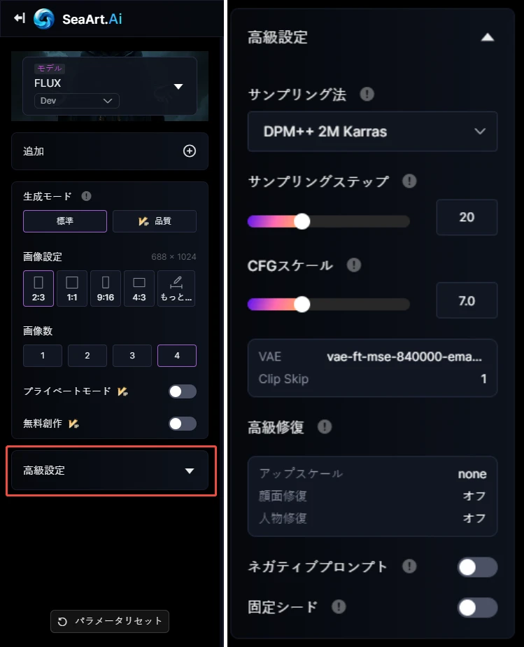 ②Fluxモデルの上級設定に、サンプリング方法、サンプリングステップ、テキスト強度調整オプションを追加