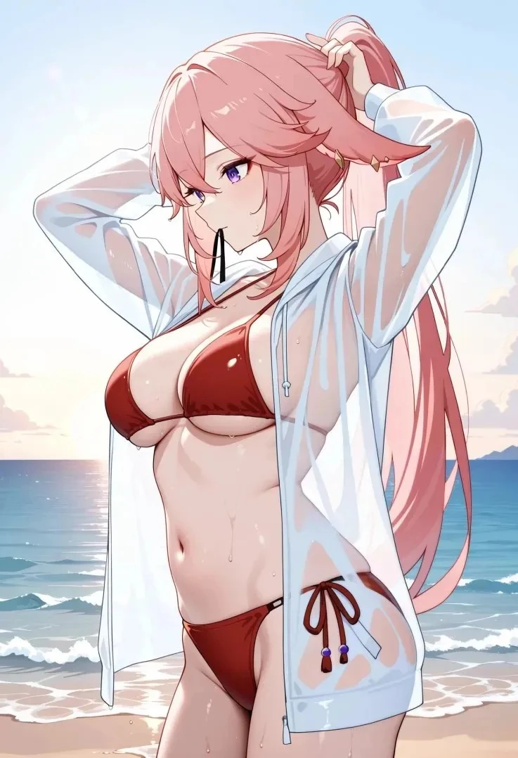 `1girl, yae miko, genshin impact, solo, string ?, swimsuit, red ?, (wet:1.25), see-through clothes, see-through jacket, tying hair, arm up, arm behind head, ponytail, long hair, long sleeves, standing, horizon, sky, ocean, beach, sunlight, highres, absurdres, masterpiece, best quality, amazing quality`