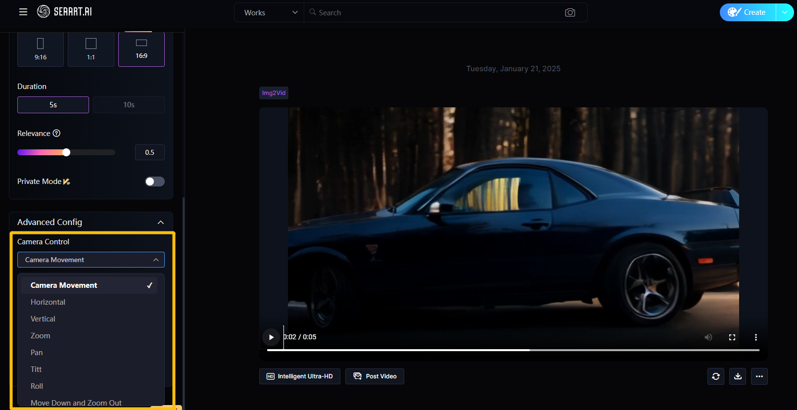 文生视频中的SeaArt Lite和SeaArt Ultra都支持运镜控制,其中包括水平运镜、垂直运镜、推进/拉远、垂直摇镜、旋转摇镜、水平摇镜、左旋推进、右旋推进、推进上移、下移拉远一共10个运镜