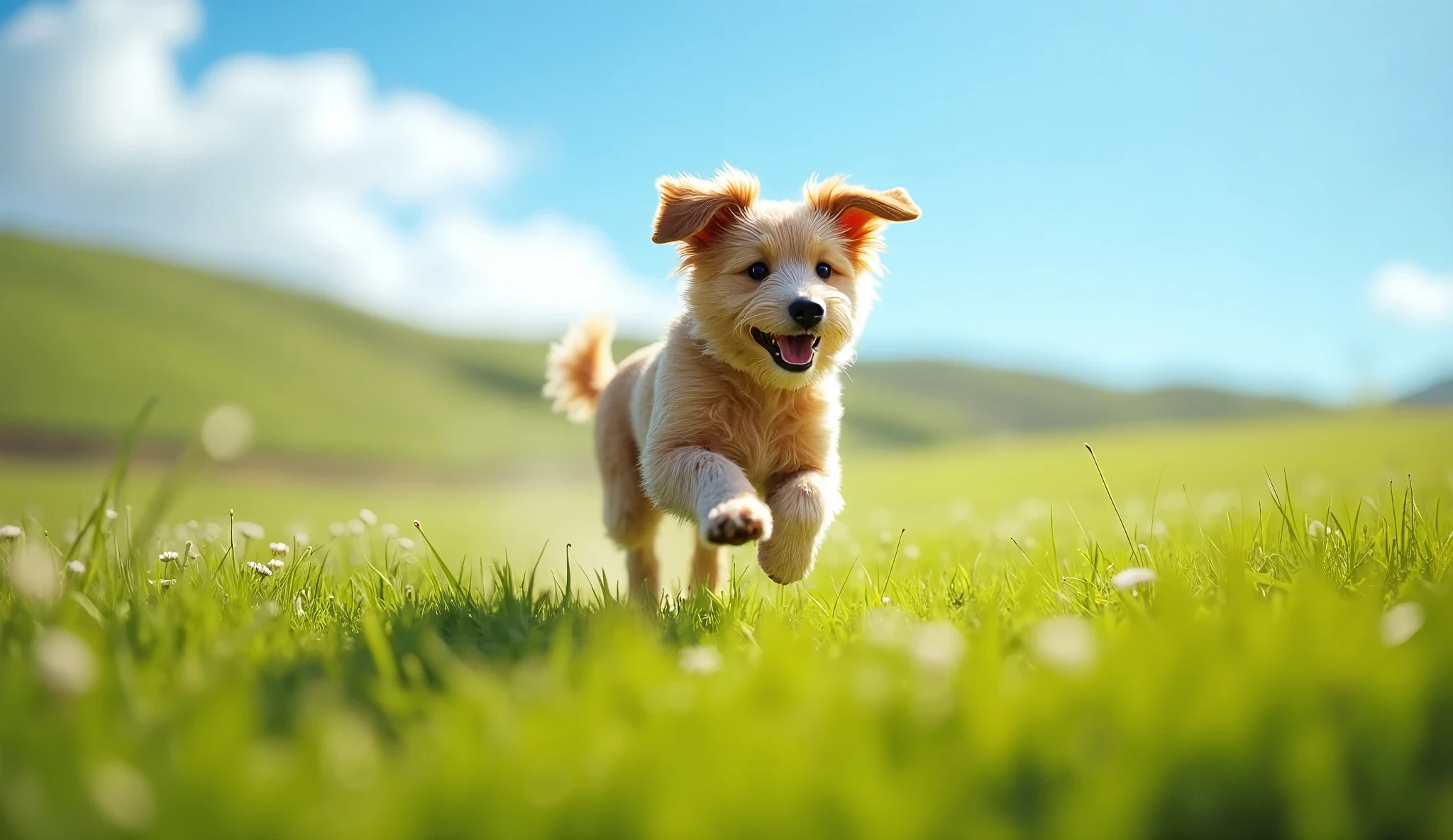 一只狗在草地上飞奔,快速转弯跃起,尾巴高高翘起,镜头从低角度紧随其后,随着狗狗的奔跑不断调整焦距,捕捉它每个跃起和奔跑的瞬间,阳光斜射在它的毛发上,草地被暖色光线渲染,背景的蓝天和白云在轻风中轻轻飘动,整个场景充满活力与温暖的清晨氛围。