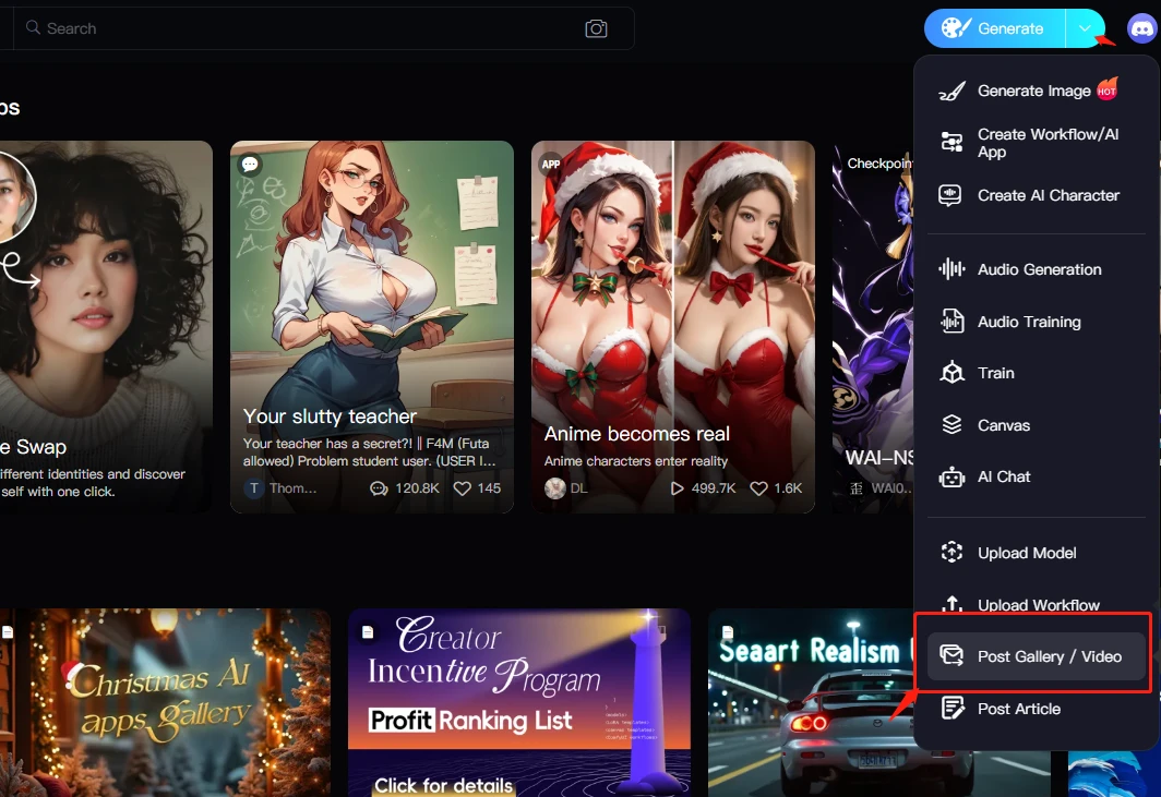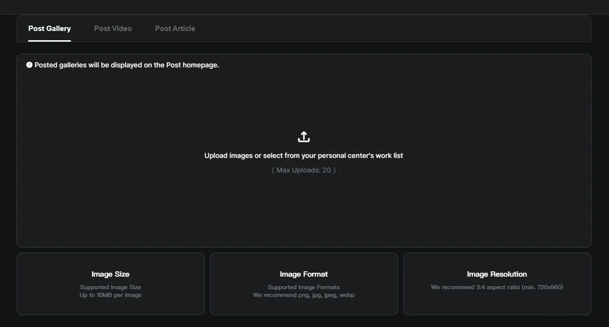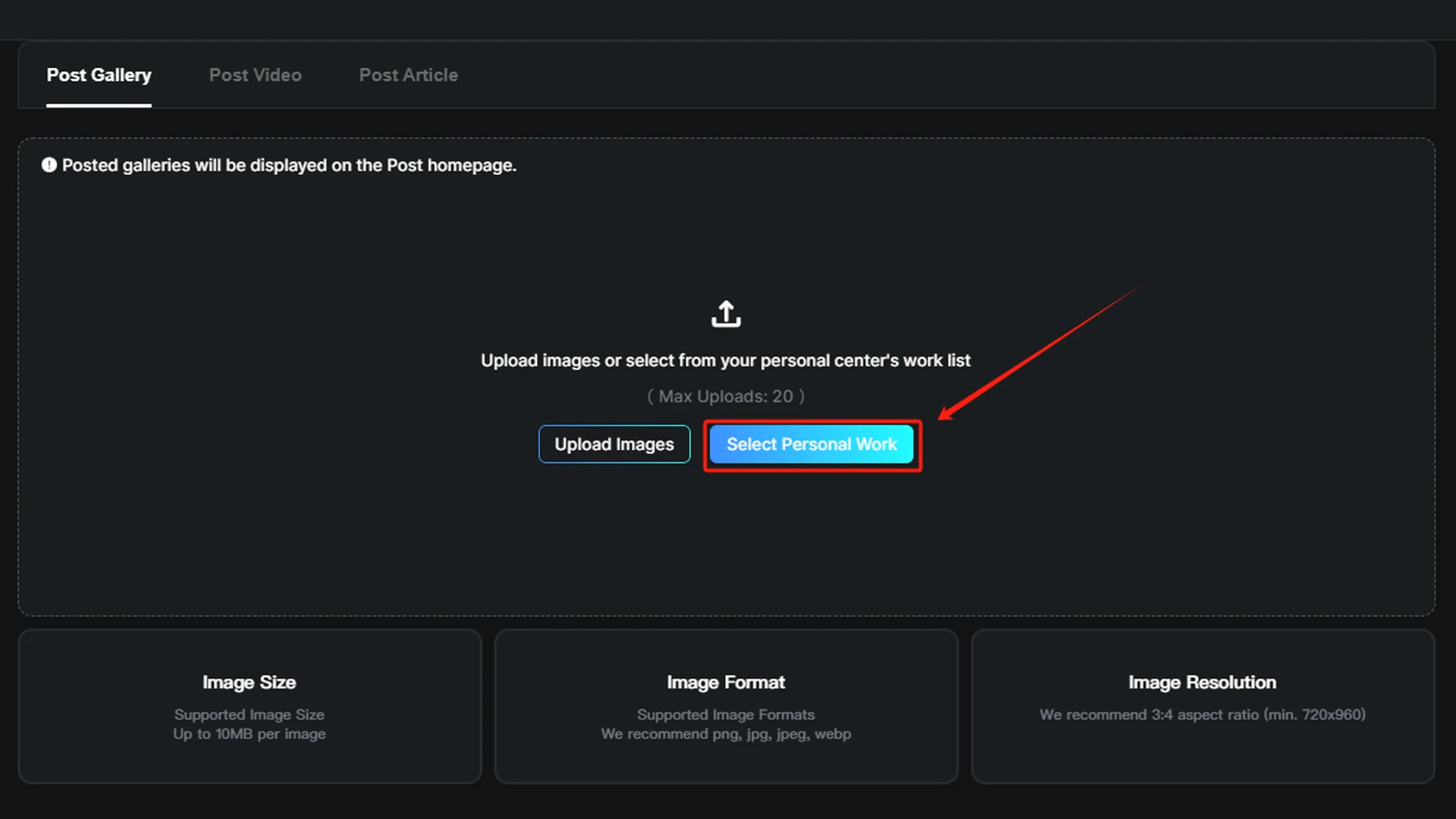 1. Click "Post Gallery/Video“ button, and select personal work.