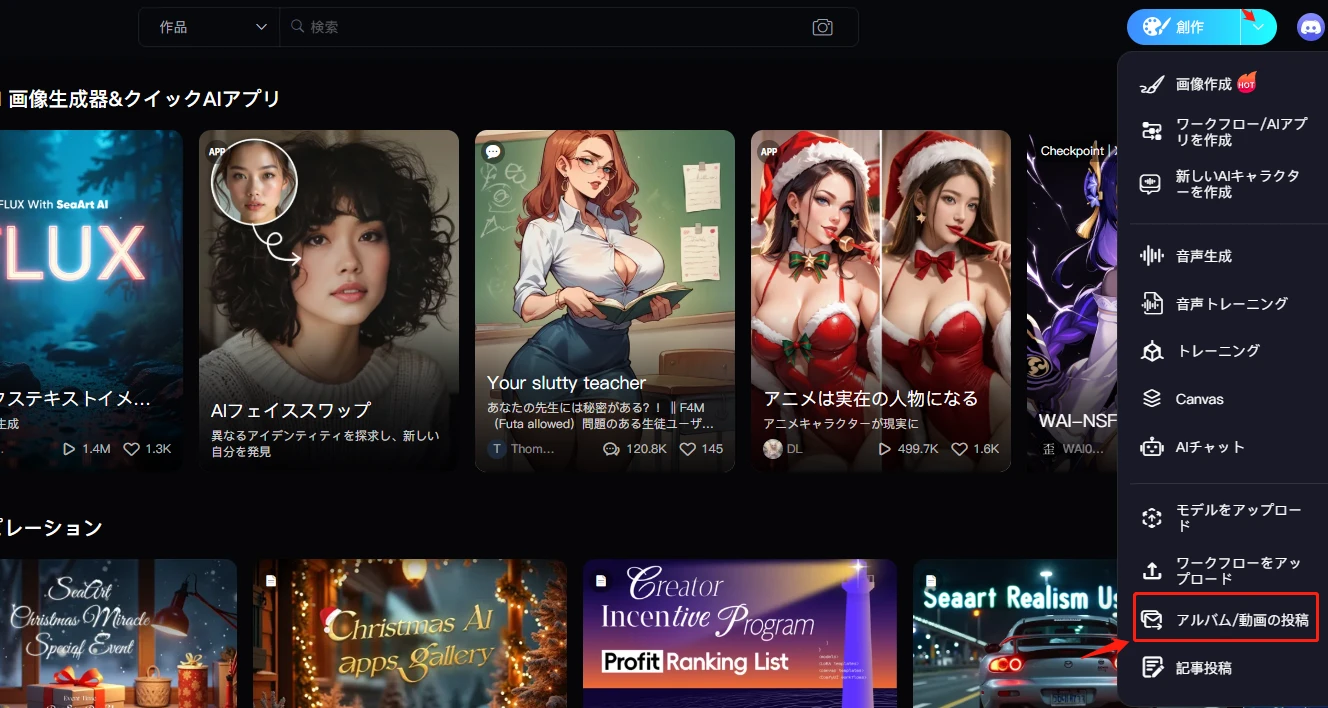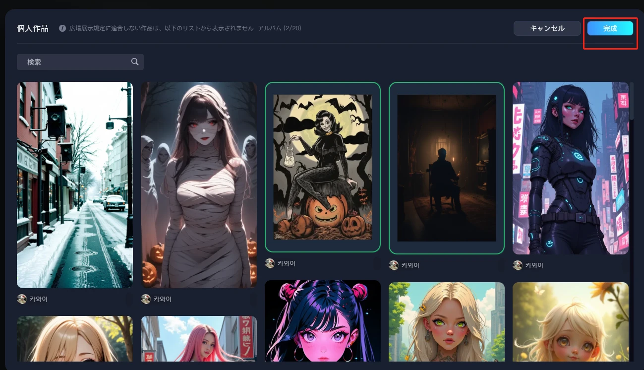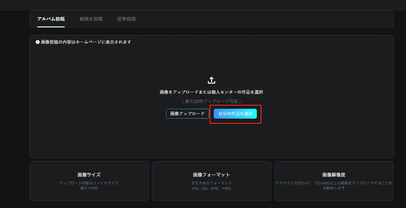 1. 「投稿」ボタンをクリックし、個人作品を選択します。