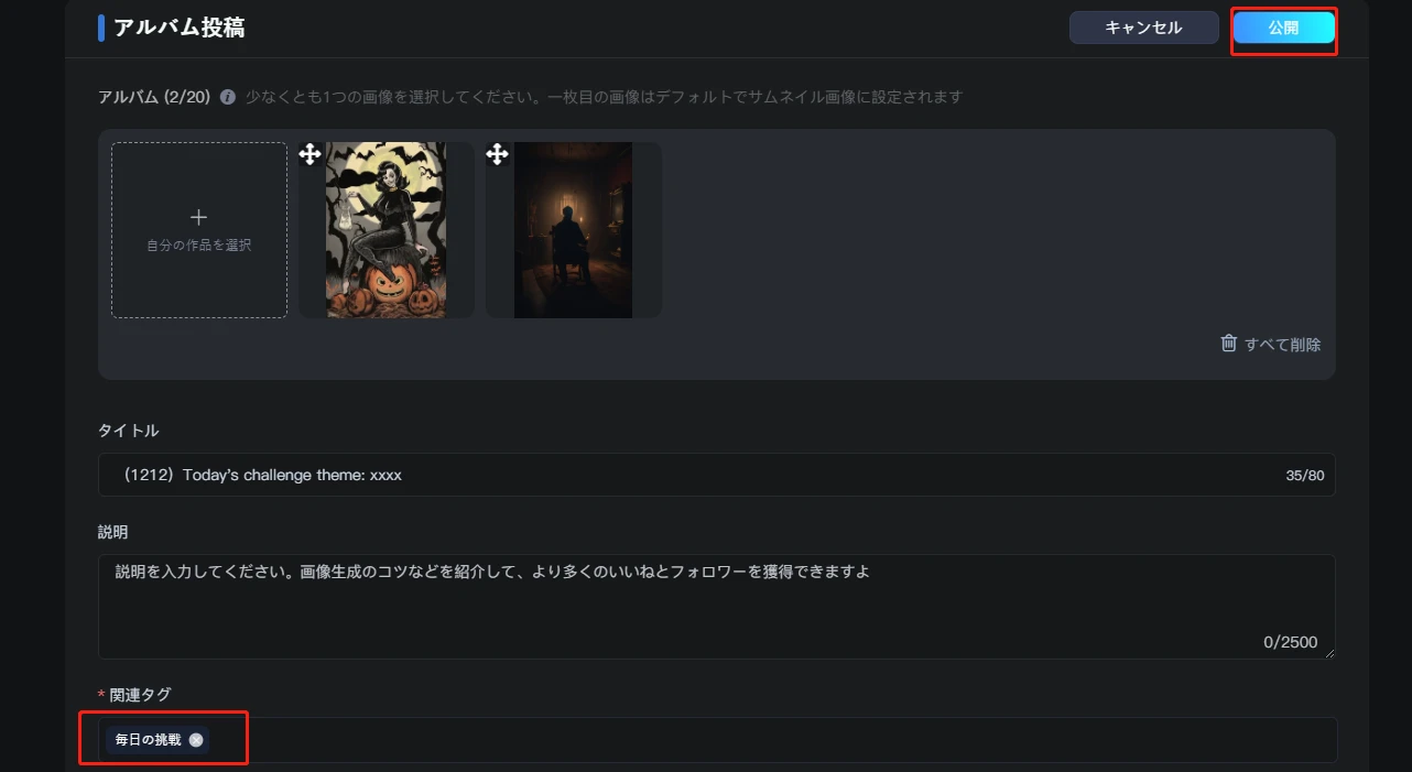 3.投稿を編集し、#毎日の挑戦 タグを追加して公開します。