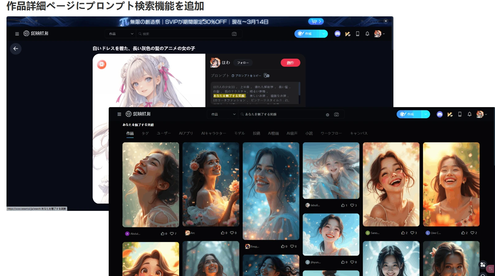 ▪ 作品詳細ページにプロンプト検索機能を追加:作品のプロンプト部分にマウスを合わせると、関連検索に素早くジャンプ