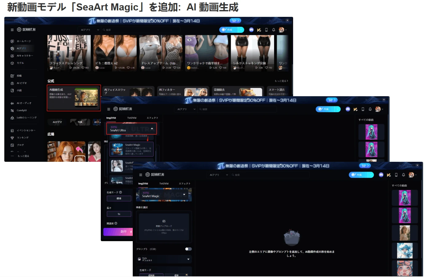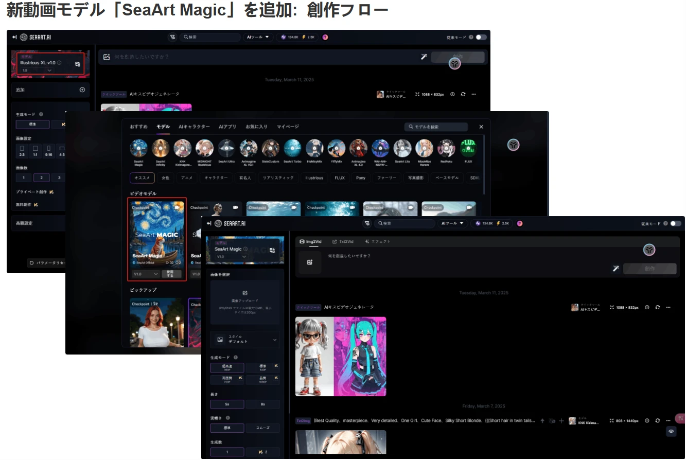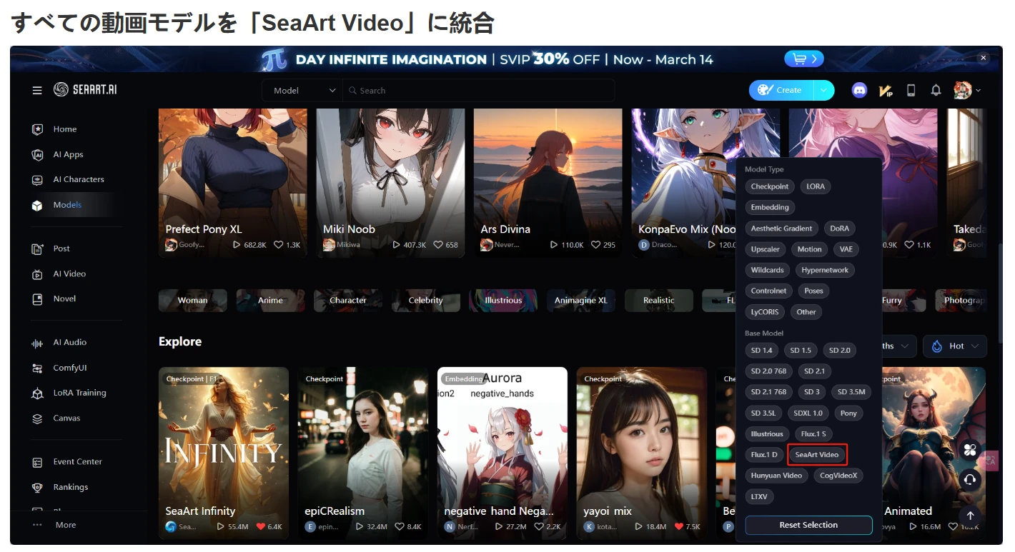 ▪ モデルフィルターオプションを調整:すべての動画モデルを「SeaArt Video」に統合。「すべて」フィルターで全ての動画モデルを表示可能。対象ページはホームページ、モデルページ、モデルタグページ、および創作フローのモデル選択ポップアップ