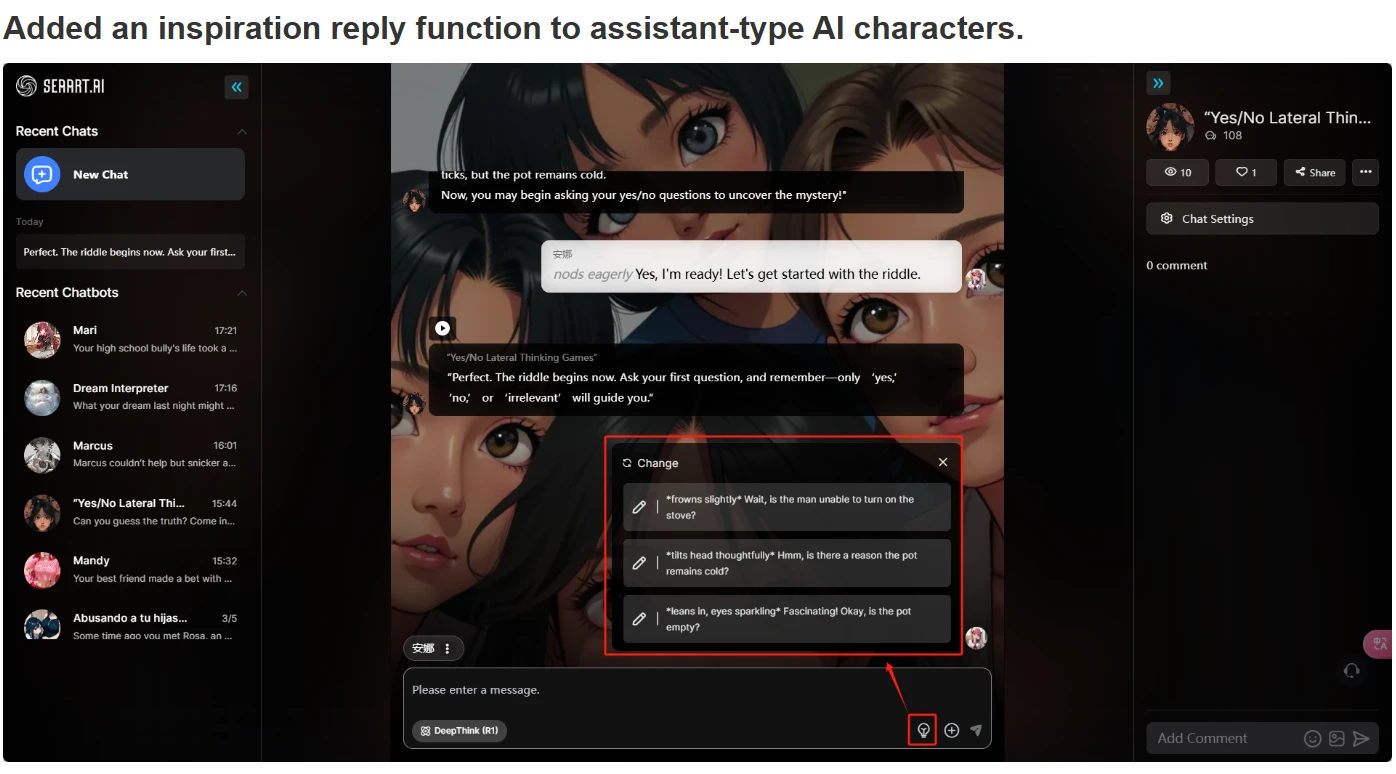 ▪ Added an inspiration reply function to assistant-type AI characters.   ▪ Added support for continuing conversations when switching between web pages or chats.