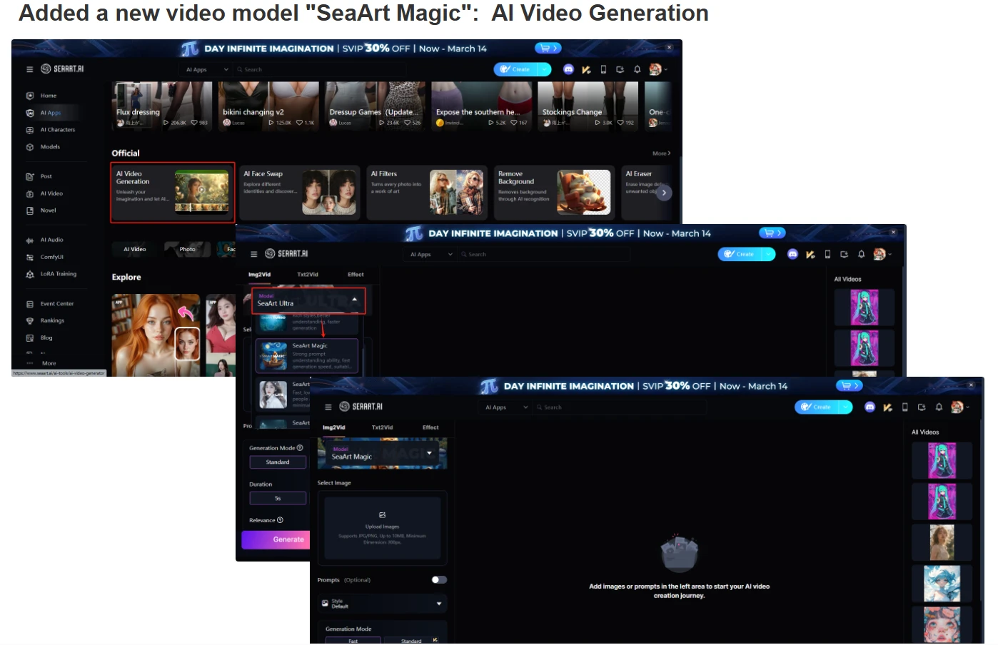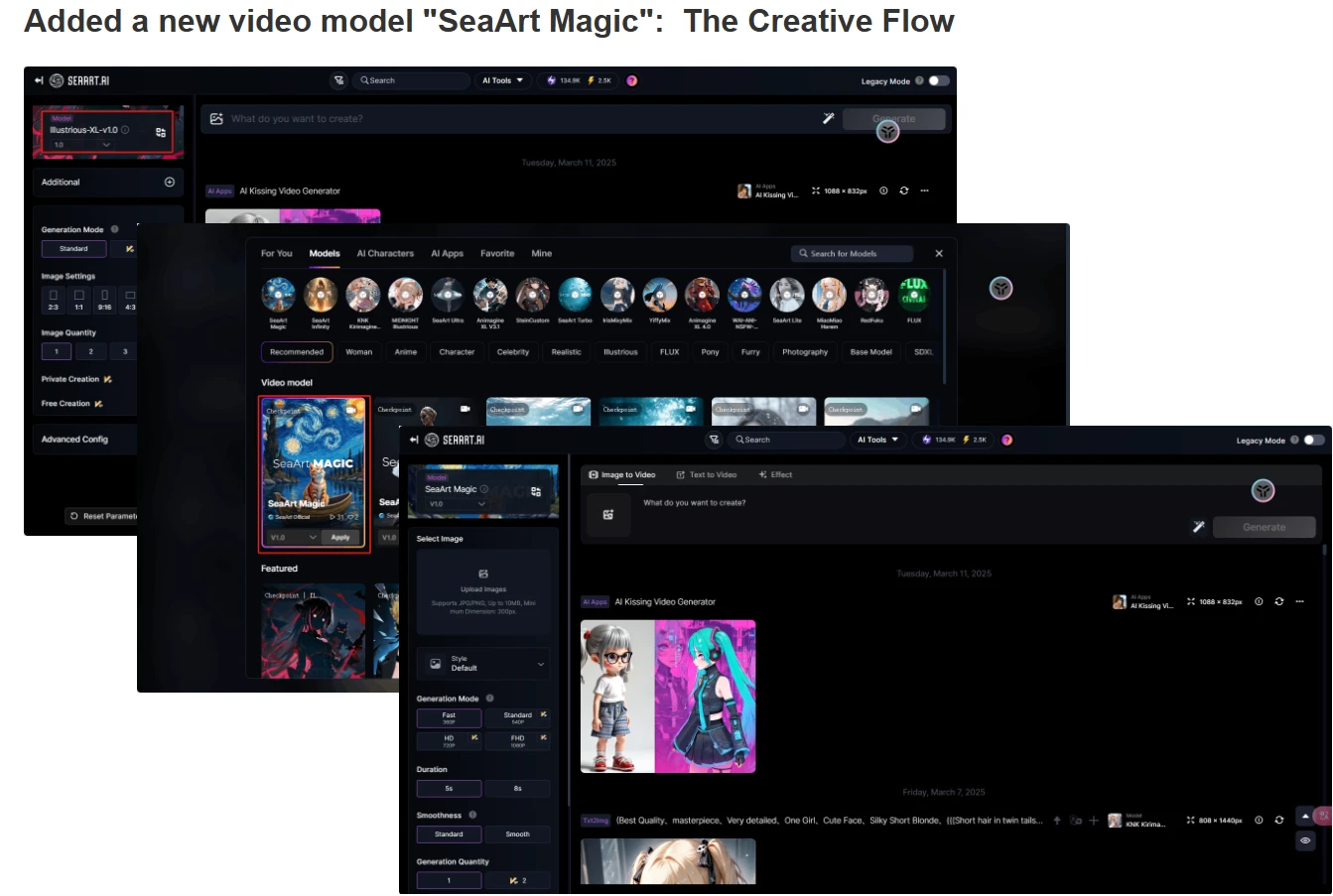 ▪ Model Filter Adjustments: All video models are now unified as "SeaArt Video." All video models can be viewed under the "All" filter. This affects the homepage, model page, model tag page, and model selection popup in the Creation Flow.