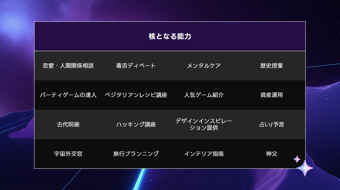 大まかなキャラクターコンセプトが決まったら、まずはAIキャラクターの核となる能力(何をしてくれるのか)を明確にしましょう。