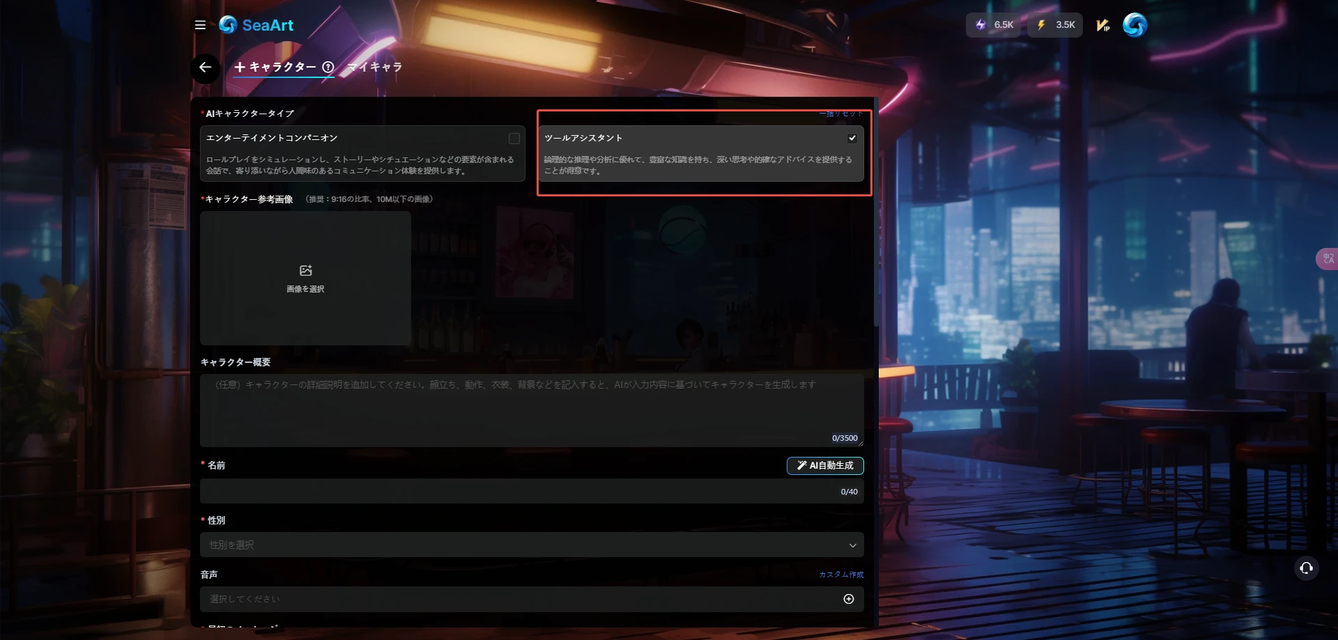 (2)AIアシスタントタイプを選択し、キャラクター参考画像をアップロード