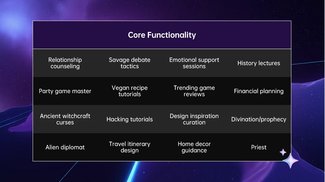 Once you have a rough character concept, your first priority is to define the core functionality of your AI Character — what it can actually do for you.