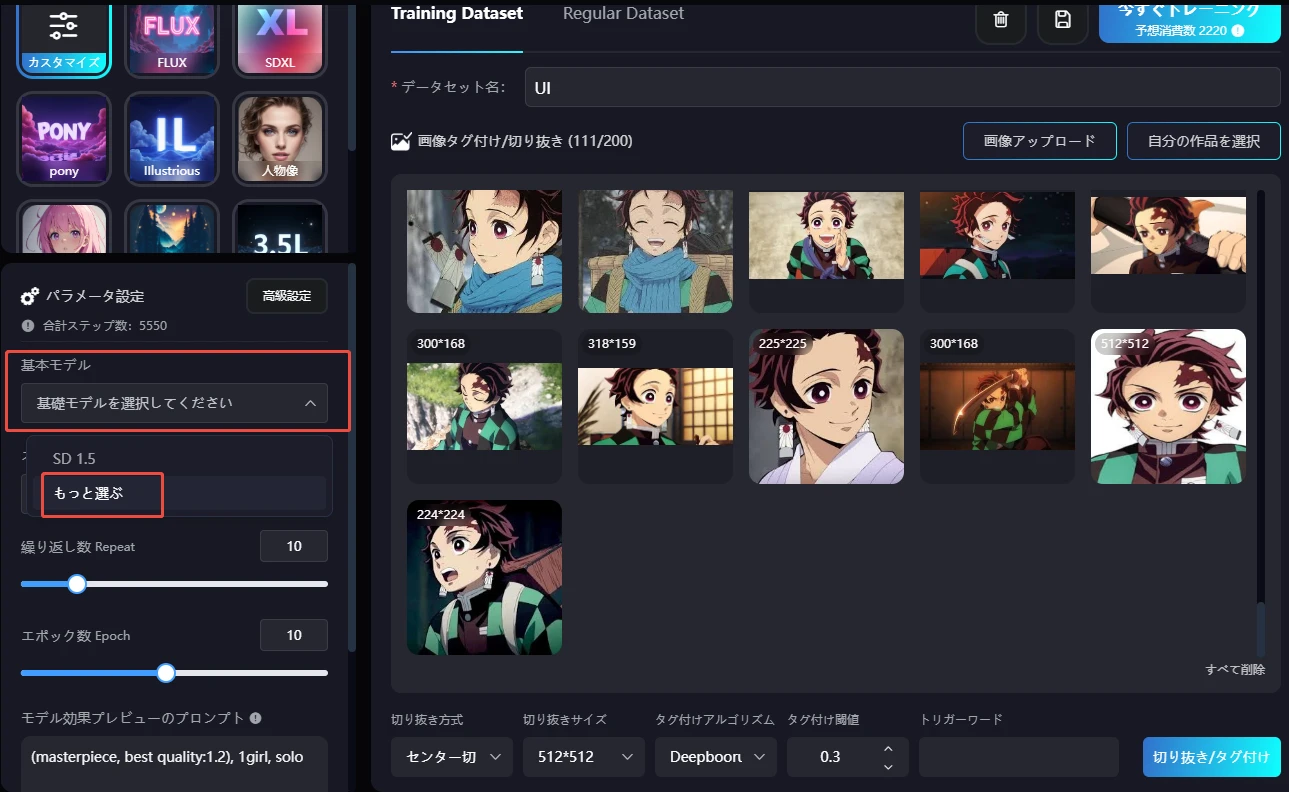 ベースモデル:Loraのスタイルに密接に合致する高品質で?したベースモデルを選択することを推奨します。これにより、AIが特徴をマッチングしやすく、違いを記録しやすくなります