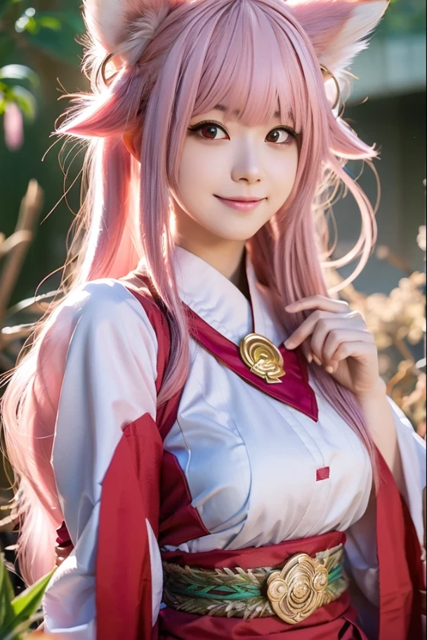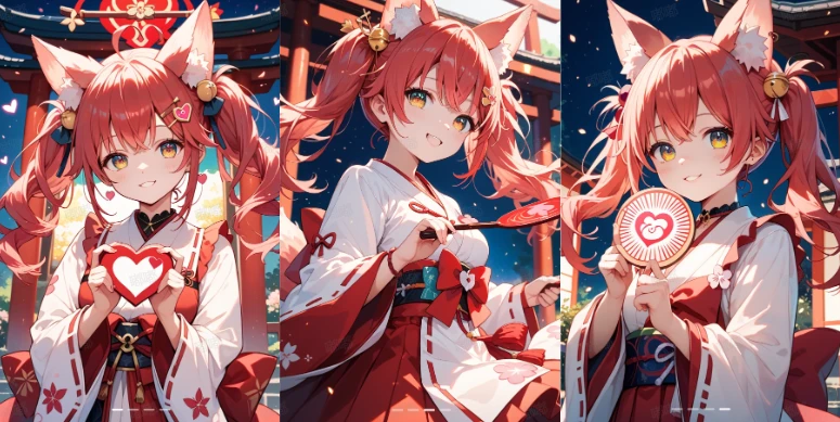 white and red shrine maiden outfit, fox ears, heart sticker near eye,