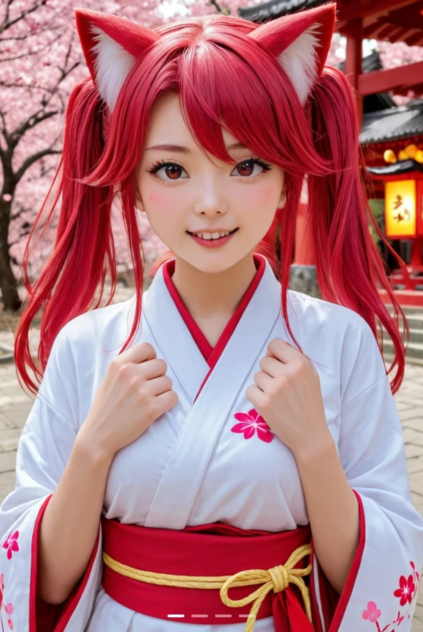 white and red shrine maiden outfit, fox ears, heart sticker near eye,