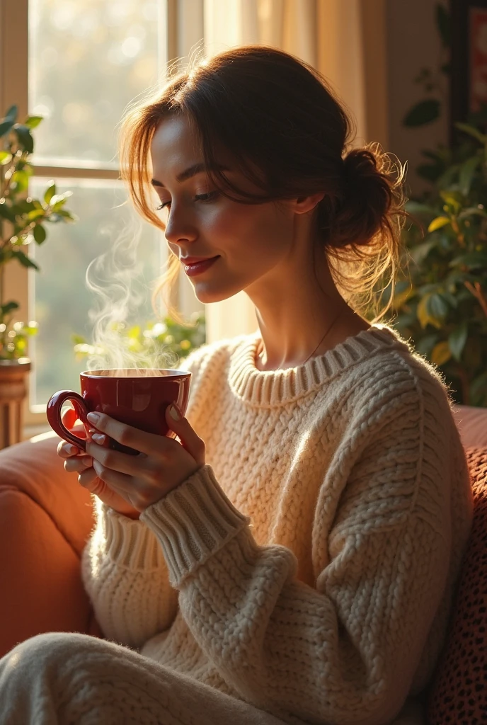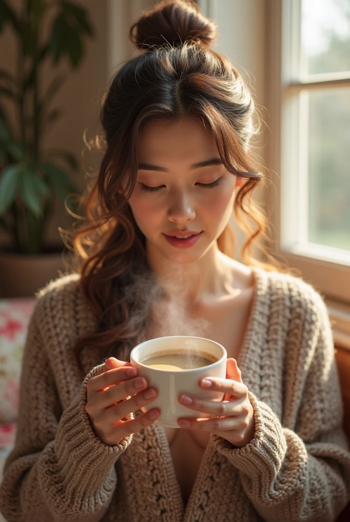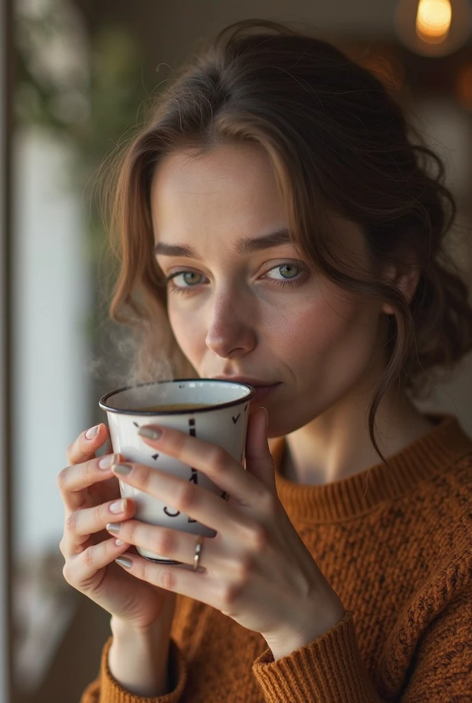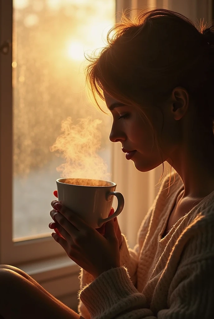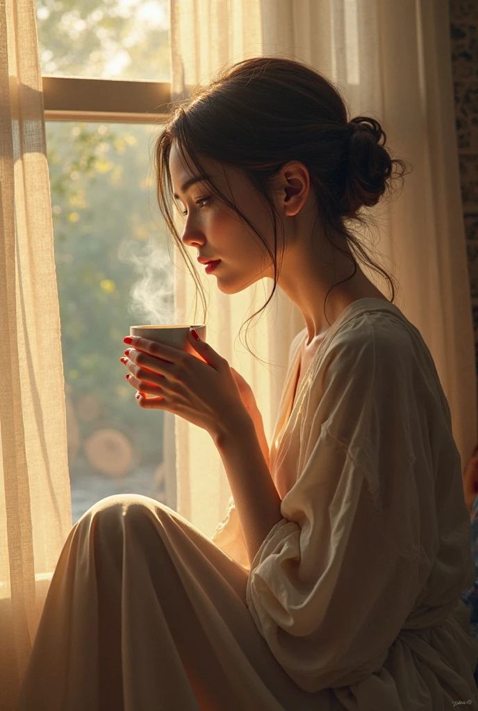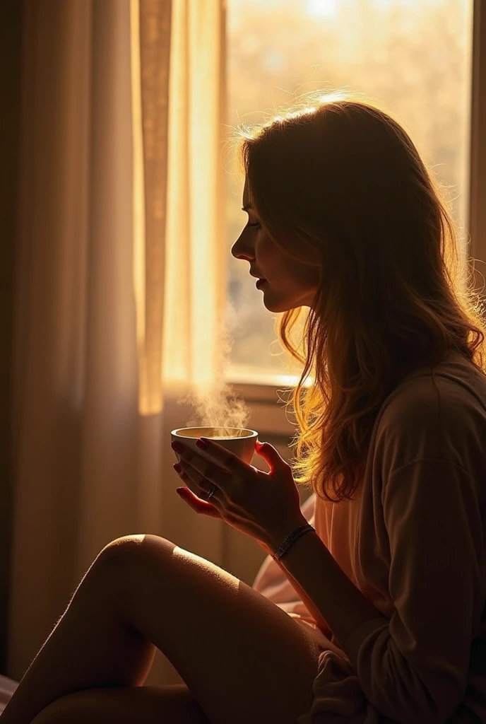 "In the quiet glow of the morning light, a woman sits by a fogged-up window, her slender fingers gently wrapped around a porcelain cup filled with steaming coffee. Wisps of aromatic vapor curl into the air, dancing with the golden sunbeams that filter through sheer curtains. As she lifts the cup to her lips, time seems to pause—her gaze distant, lost in thought, contemplating the echoes of yesterday or the promises of tomorrow. The liquid warmth cascades over her tongue, comforting, awakening, fueling her soul with quiet resilience. Every sip is a ritual, every moment steeped in an unspoken reverie"
