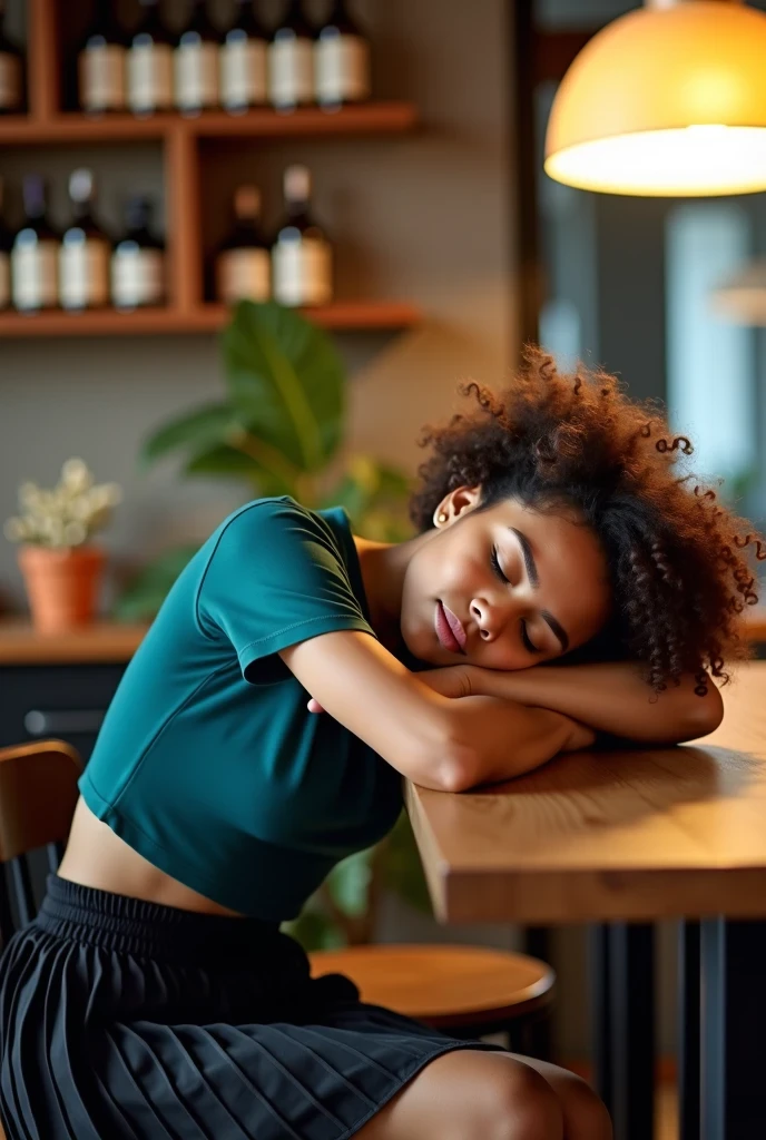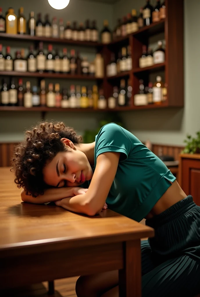 • exhausted, asleep, natural expression, curly hair, short hairstyle, teal cropped top, dark pleated skirt, casual attire, relaxed pose, resting on wooden table, closed eyes, indoor environment, bottles on shelves, warm ambient lighting, source of light coming from above, soft shadowing, cozy and quiet atmosphere, side view angle, clear focus on subject, no notable motion blur, art style enhancing details in environment
