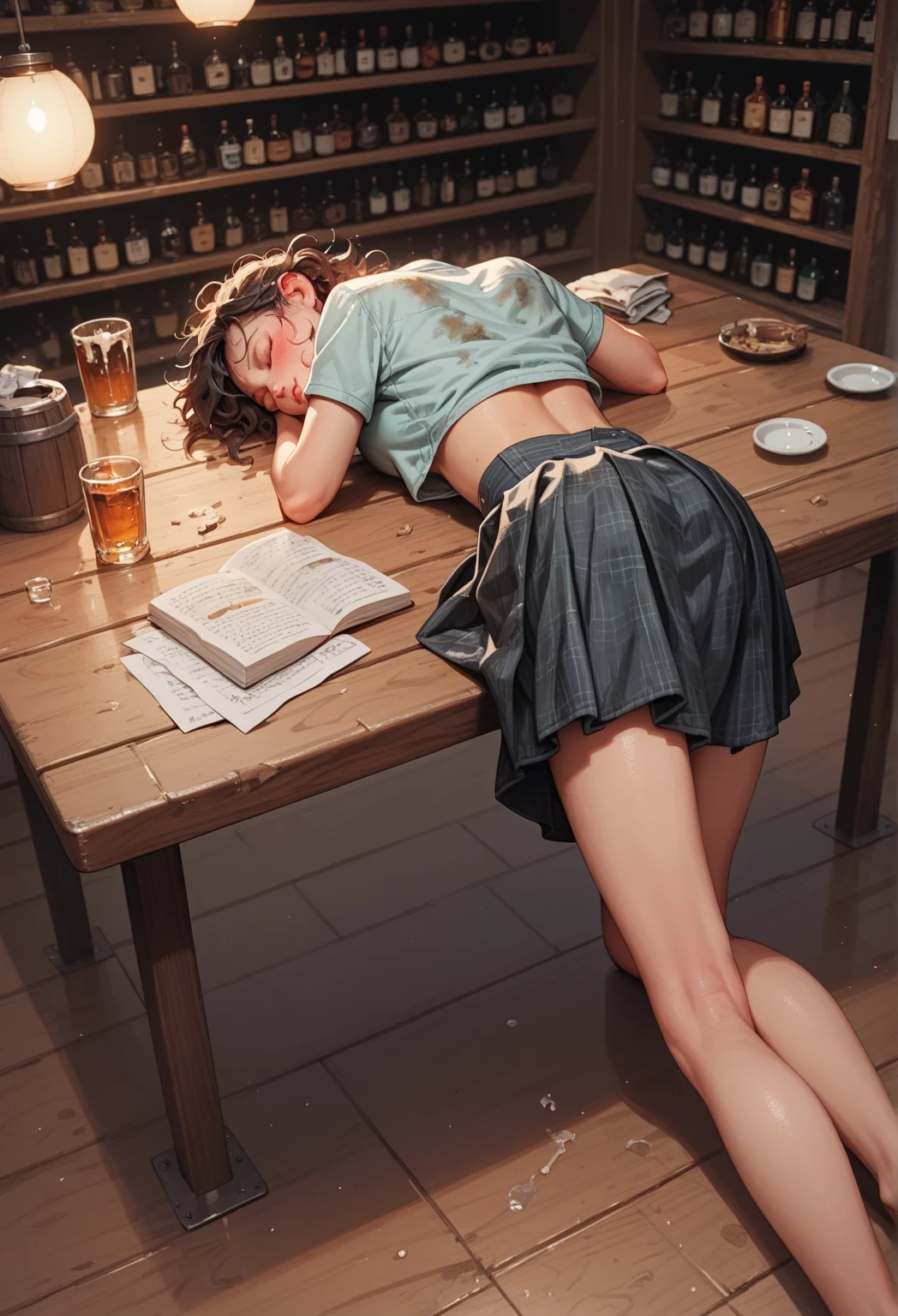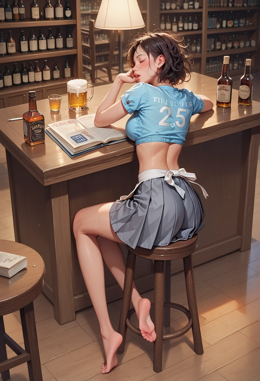 1girl, solo, ?, blush, open mouth, short hair, shirt, skirt, brown hair, black hair, closed mouth, jewelry, closed eyes, ?, short sleeves, thighs, pleated skirt, parted lips, lying, indoors, artist name, medium hair, midriff, black skirt, miniskirt, from behind, apron, crop top, cup, blue skirt, legs, wet, lips, book, feet out of frame, ? legs, shadow, back, chair, shirt lift, table, blue shirt, sleeping, bottle, ?, t-shirt, messy hair, waist apron, light particles, grey skirt, drinking gl?, alcohol, cigarette, head rest, ice, paper, wooden floor, mug, open book, on floor, drink, nose, kneepits, bookshelf, pen, gl?, lamp, waitress, drunk, crop top overhang, stool, beer, beer mug, jar, library, bar \(place\), spill, ice cube, counter, menu, wooden table, unconscious, bar stool, whiskey, ashtray,
