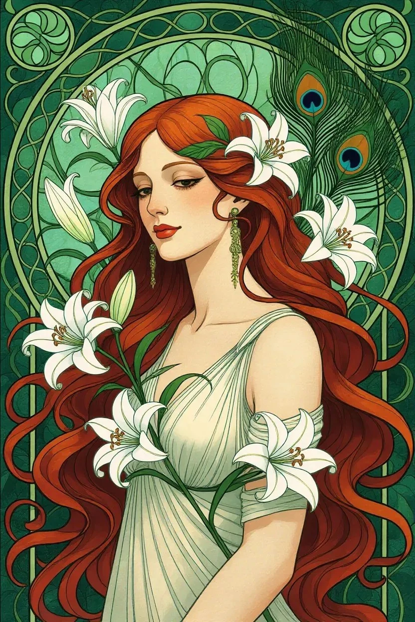 `Art Nouveau illustration of a graceful woman with long auburn hair intertwined with blooming lilies and delicate peacock feathers. Background is filled with swirling organic lines, stylized floral motifs in shades of emerals green and gold, and subtle, stained glass effect. Curvilinear style of Art Nouveau.`