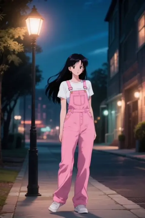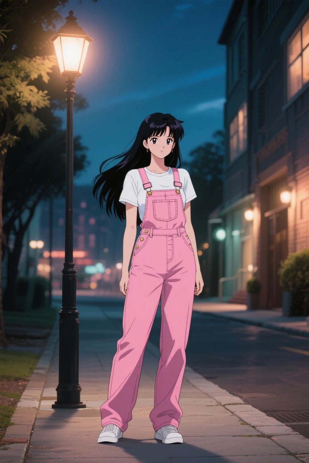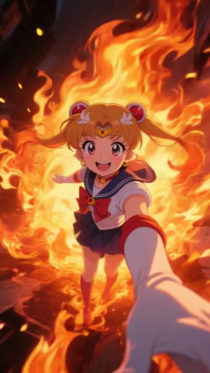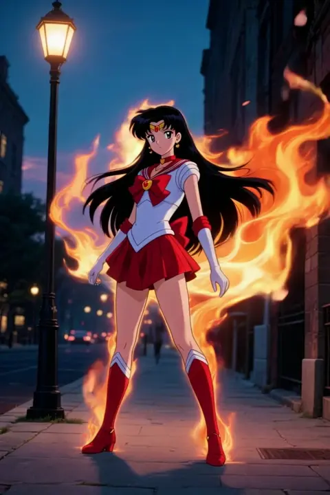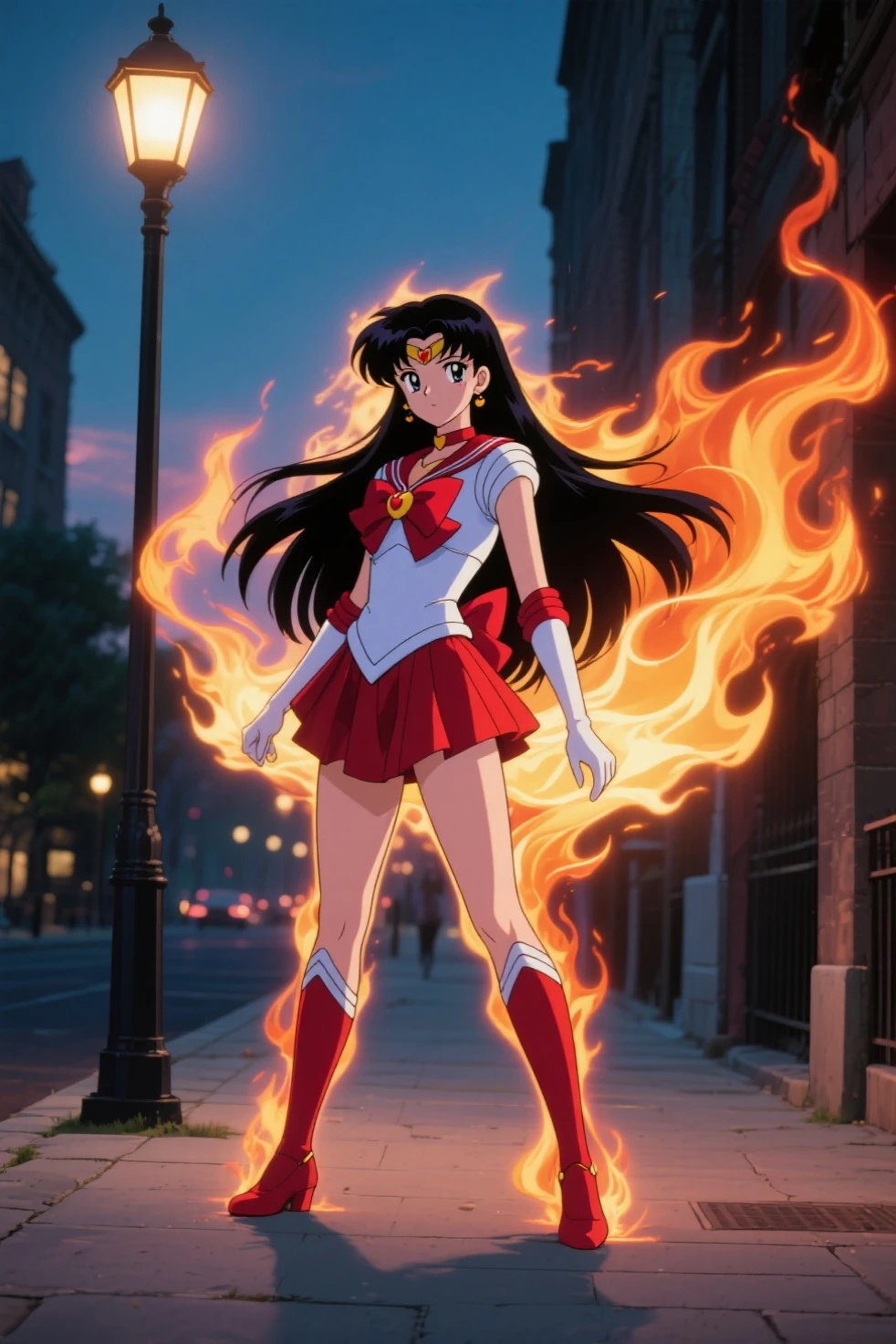 an Anime schoolgirl (Sailor Mars) posing confidently like a martial artist with flames swirling around her, while streetlights flicker and shadows dance on the pavement, wide camera smoothly zooming in to capture her expression, vibrant 90s anime style with dramatic twilight lighting.