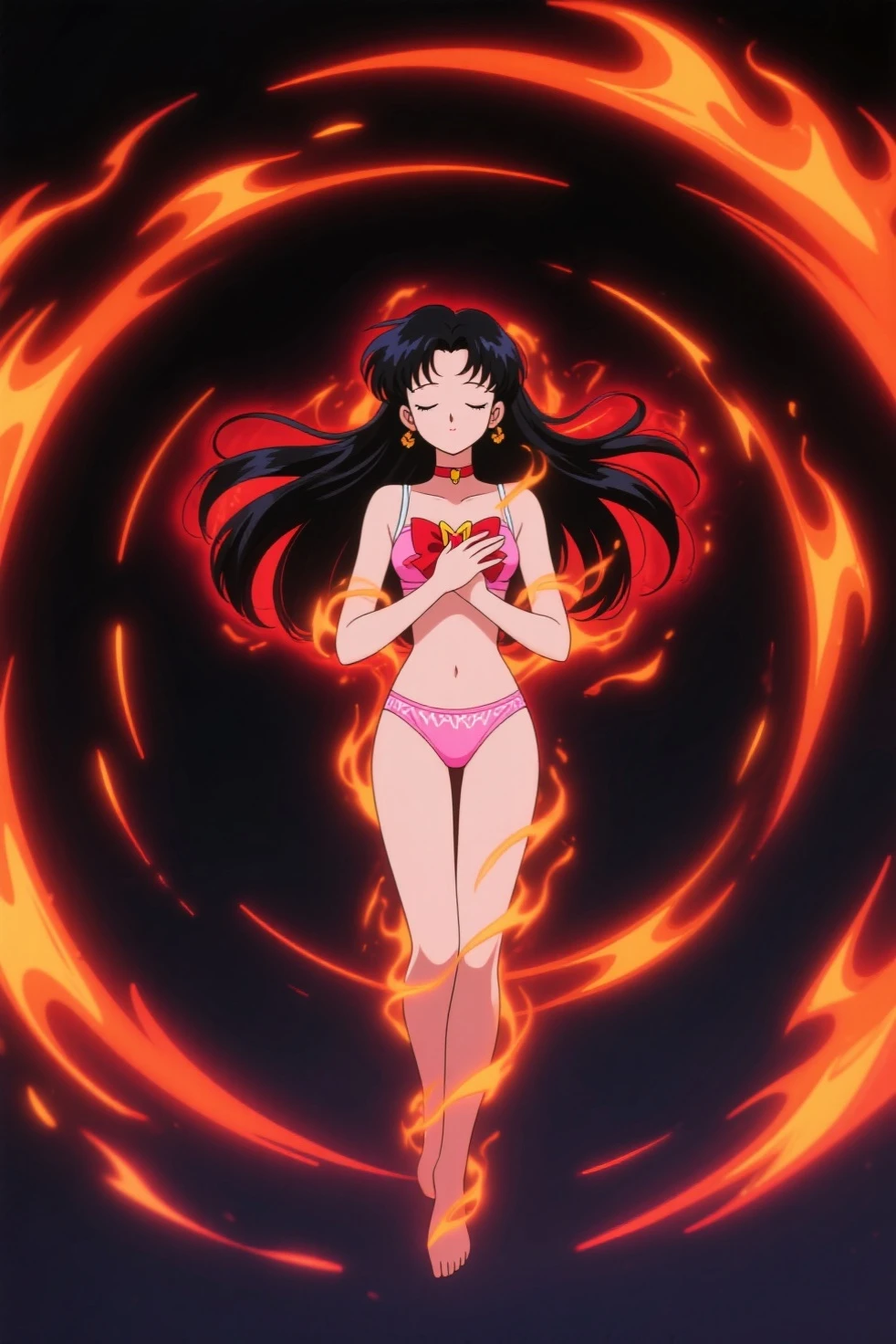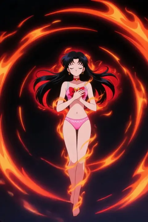 The Sailor mars standing with her hair gently swaying in the evening breeze then she leaps and levitating, the background is changing to dark, and her body is emitting fire aura, burnt her clothes and reveals her pink under wears, camera following her movement and keep the proportion, 90s anime style with twilight lighting.