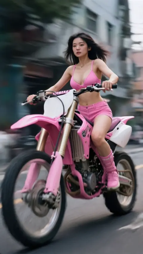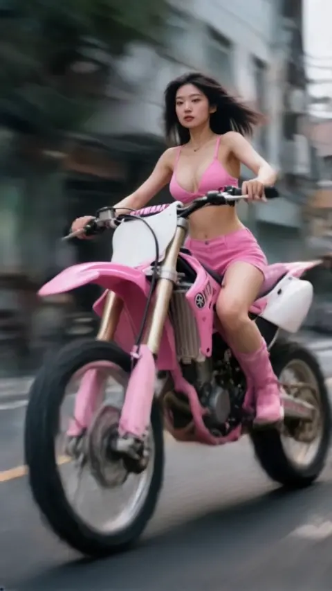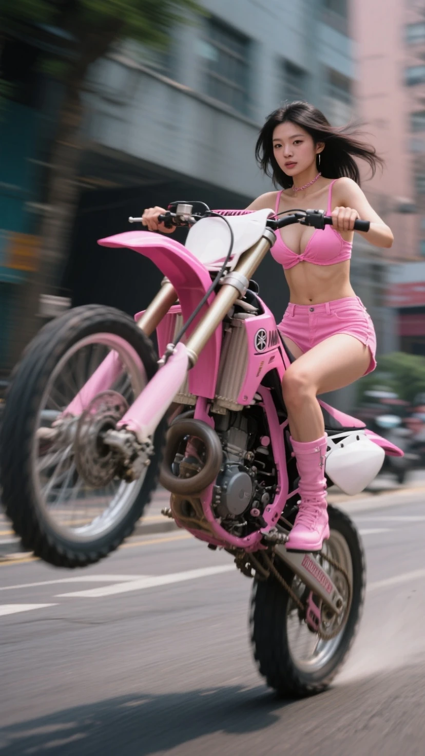 A woman in a pink outfit riding a pink dirt bike swiftly down a bustling street the she lifts the motorcycle into a wheelie action with blurred pedestrians and colorful storefronts, medium camera following from a low angle, photorealistic style with vibrant daylight.