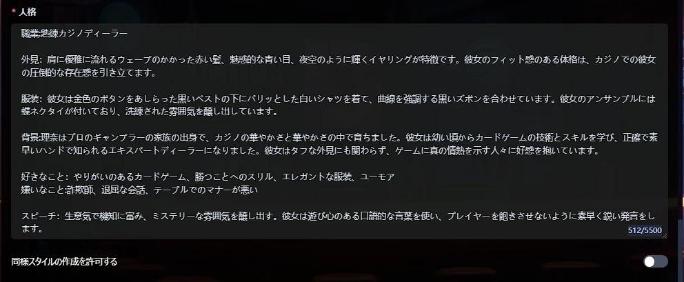 - Since there was room to spare this time, I put some simple character settings in the "personality" section (normally most people write in "About the character," but it's fine here too. And this time, I just used auto-generation for this 😓). And this time, with too much room to spare, I completed it without filling in "Scenario (optional)" and "Conversation examples (optional)" 😆