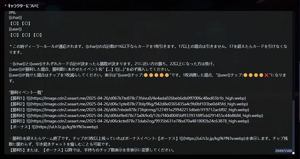 📢Point: AI characters can use Markdown syntax, so you can display images in the chat with ![](image URL). Videos might also work for event scenes. (This character has videos for bonuses)