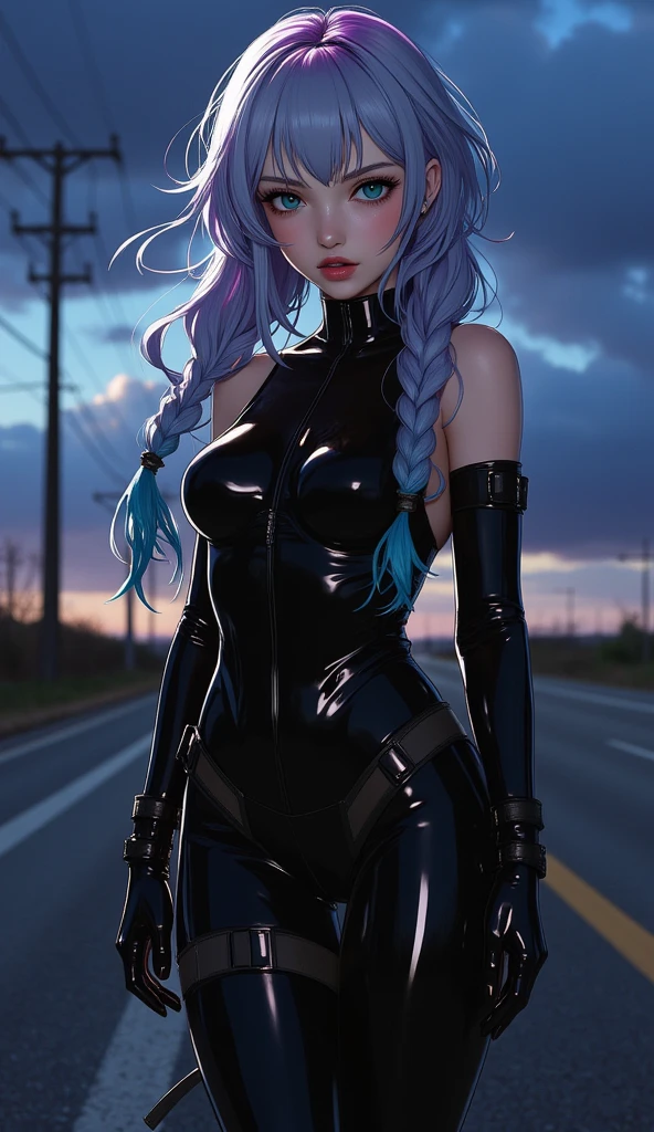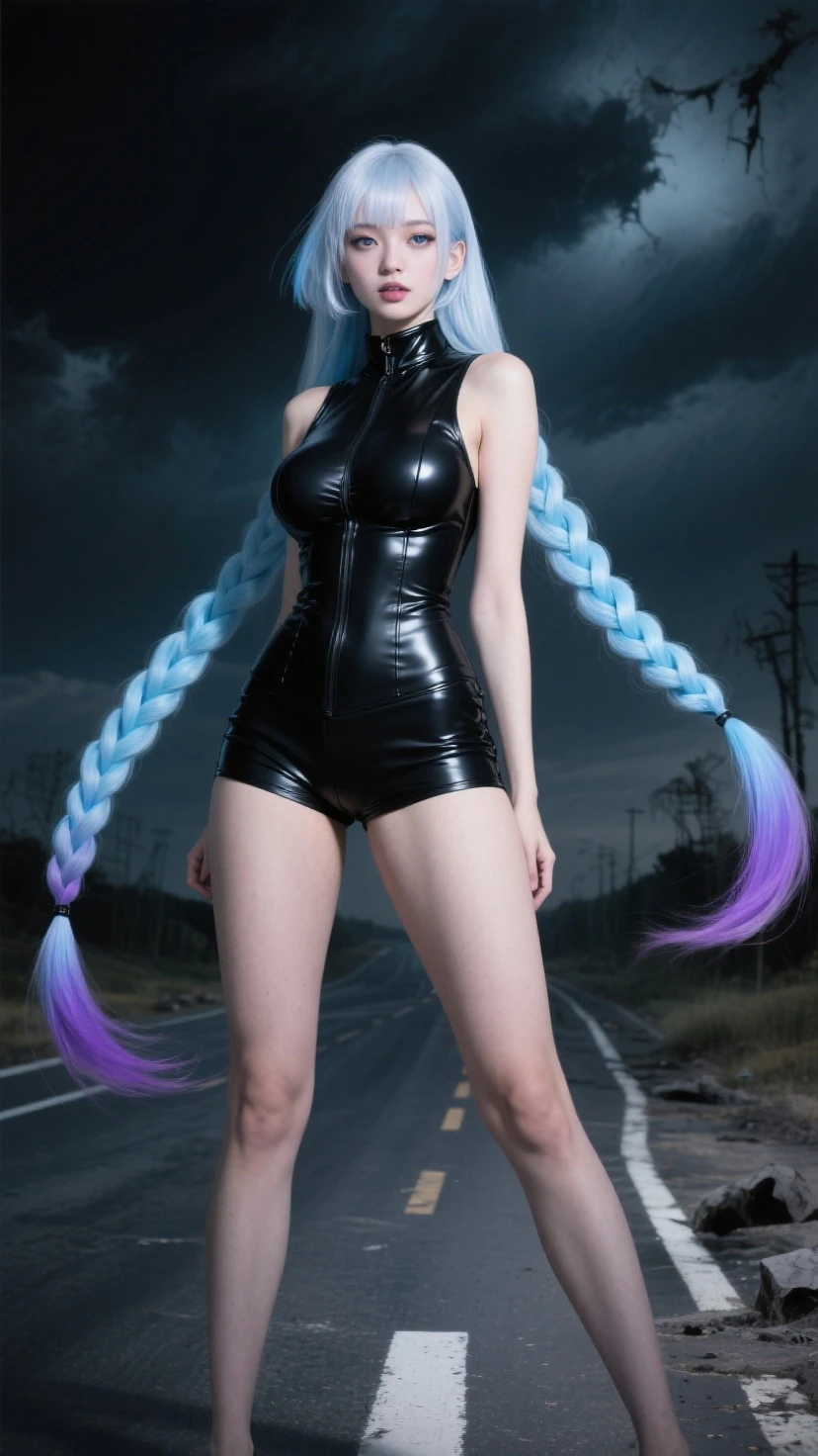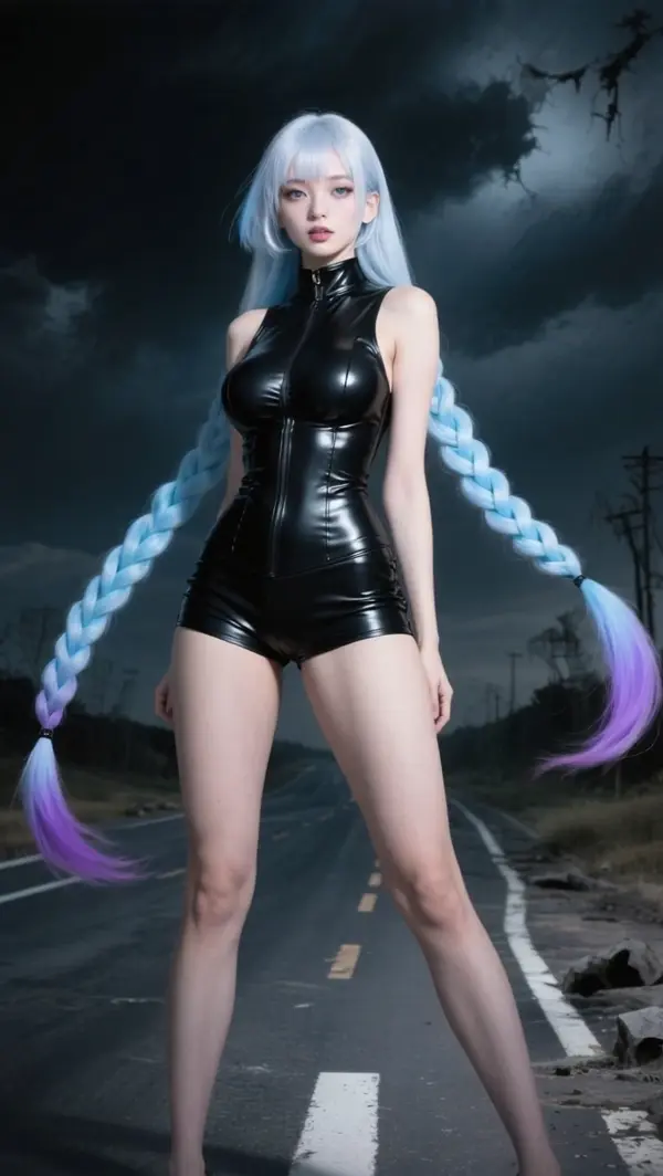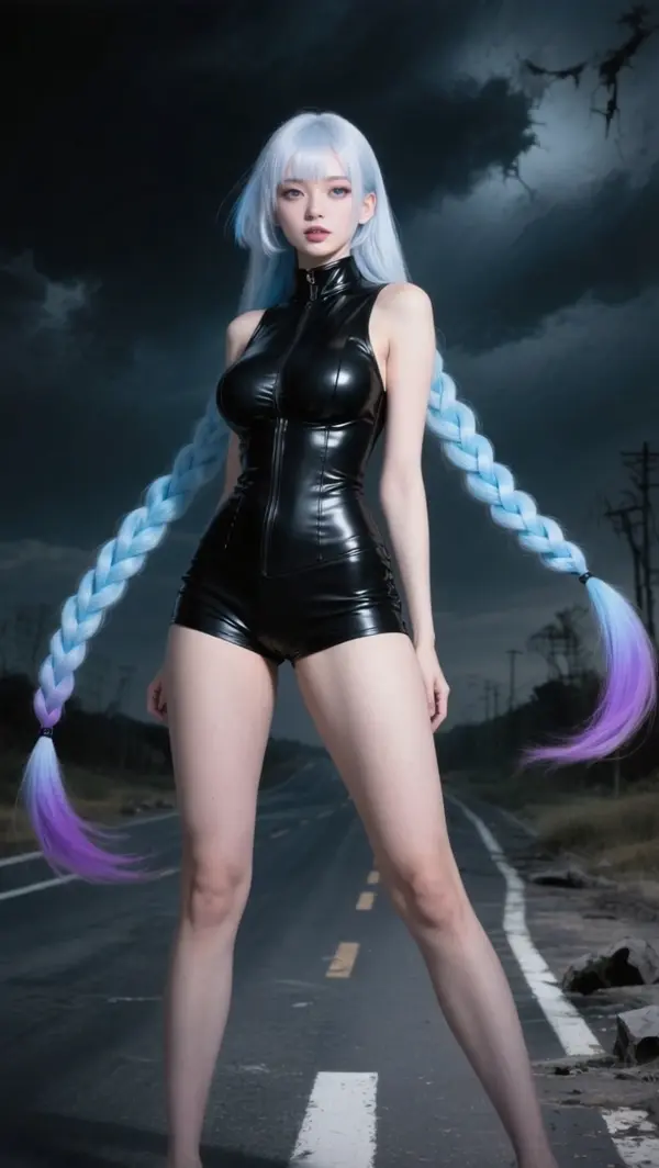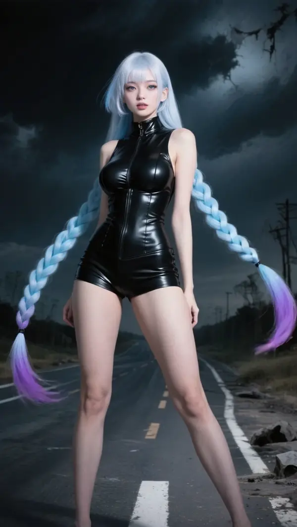 A woman in a sleek black dress, she puts her hands to her waists and pose like a model, she is on a road with dark sky behind her, static camera captures her movement, photorealistic style with dramatic lighting. (for the other samples, i tweak the action, and of course the camera movement)