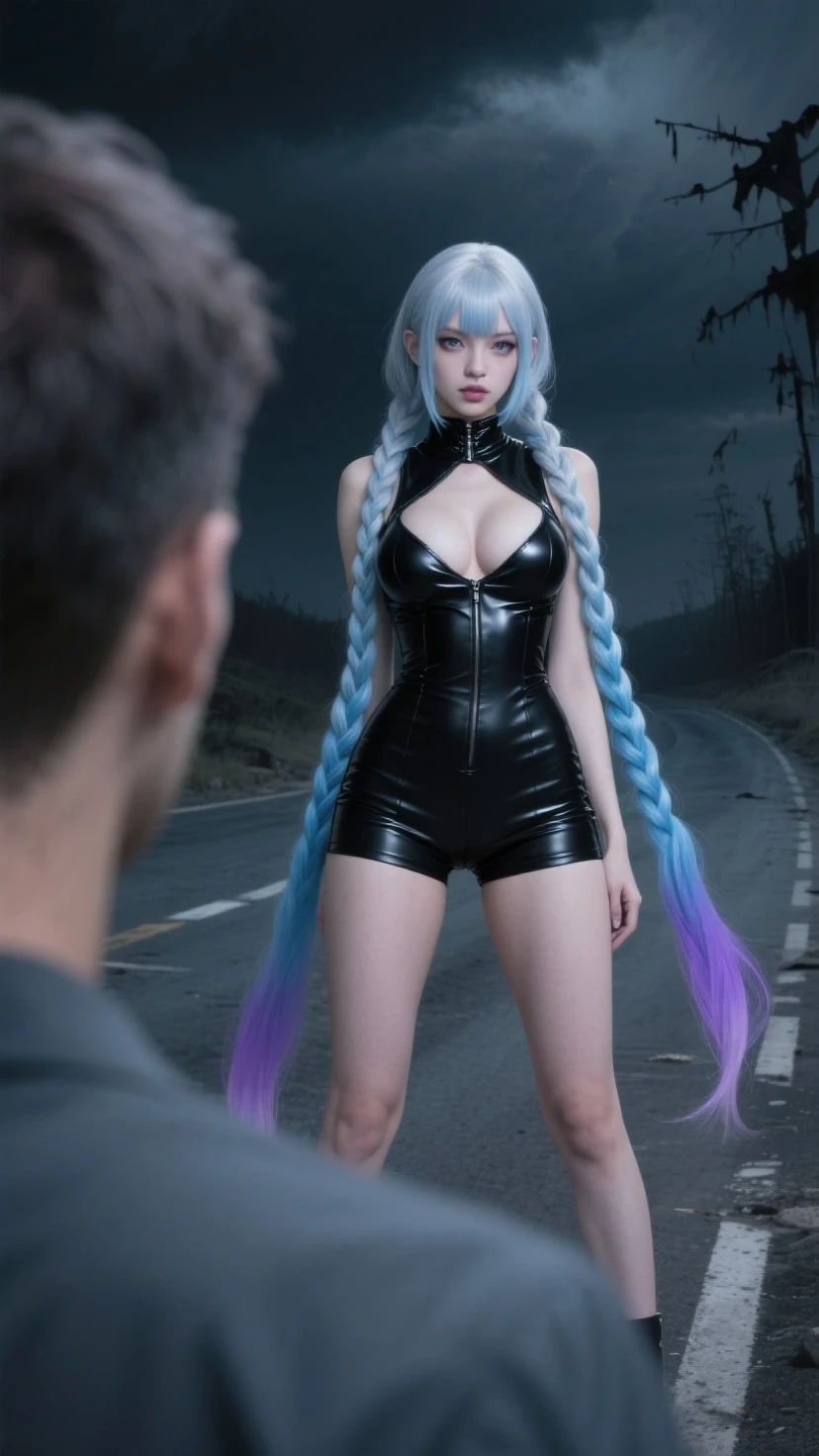 sample prompts : from over shoulder, camera zoom in to the face of a woman in a sleek black dress, camera cut to the man's face on the foreground, he is crying, on the post apocalypse road with dark sky, photorealistic style with dramatic lighting.