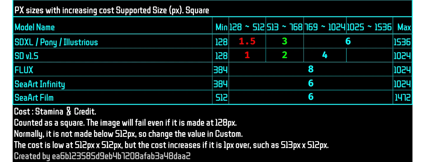 - Up to ~512px × 512px: The cost is set to a low 1.5. This range is recommended for cost-conscious generation. Be aware that the cost increases if the dimensions exceed 512px by even 1px (e.g., 513px × 512px).