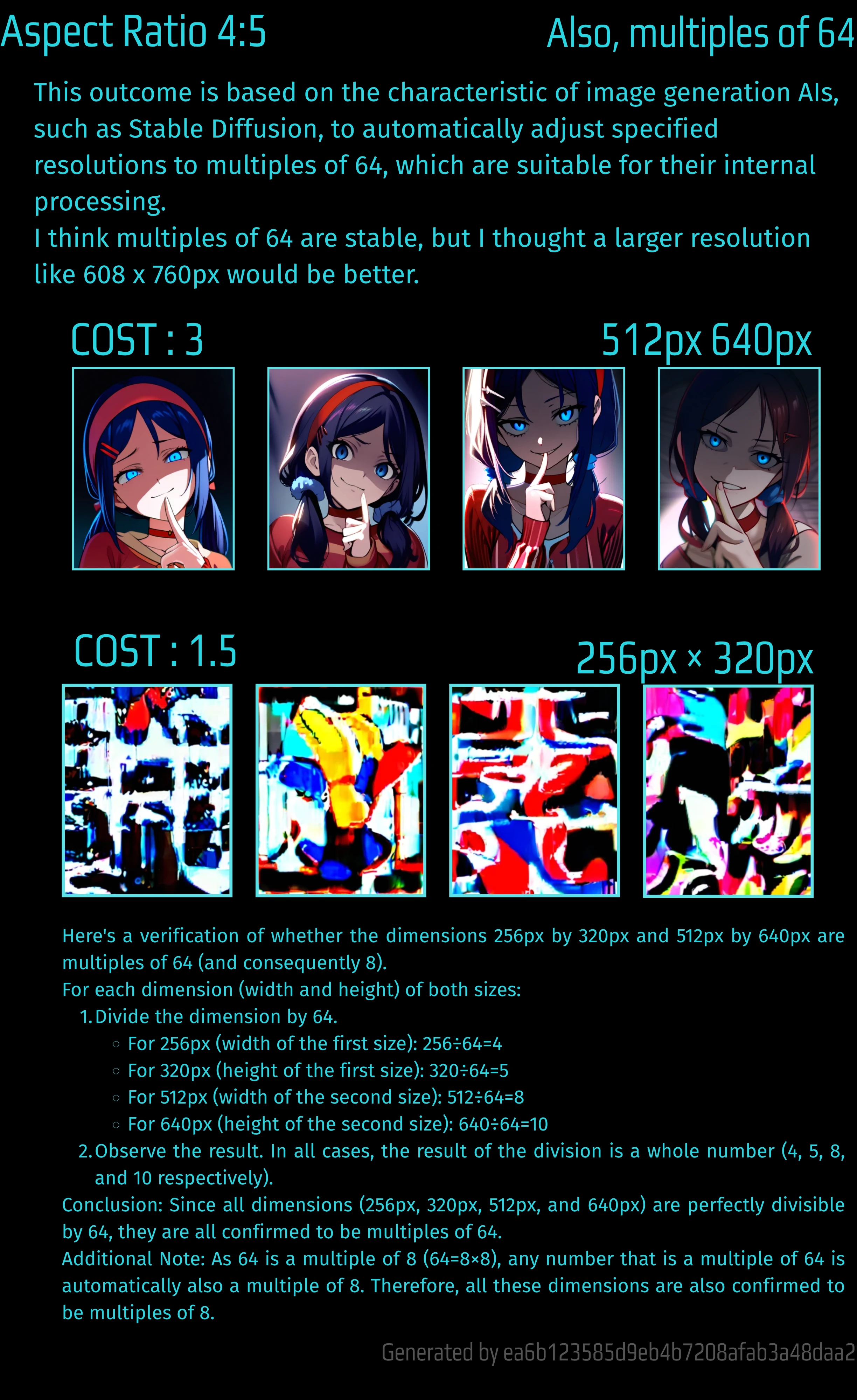 SDXL is said to be best when it is a multiple of 64. 64 is 8x8. I checked to see if there are multiples of 64 for the resolution of COST3 and COST1.5. The result was 512px x 640px for COST3. COST1.5 is 256px x 320px. The result was worse than the previous COST1.5 results.