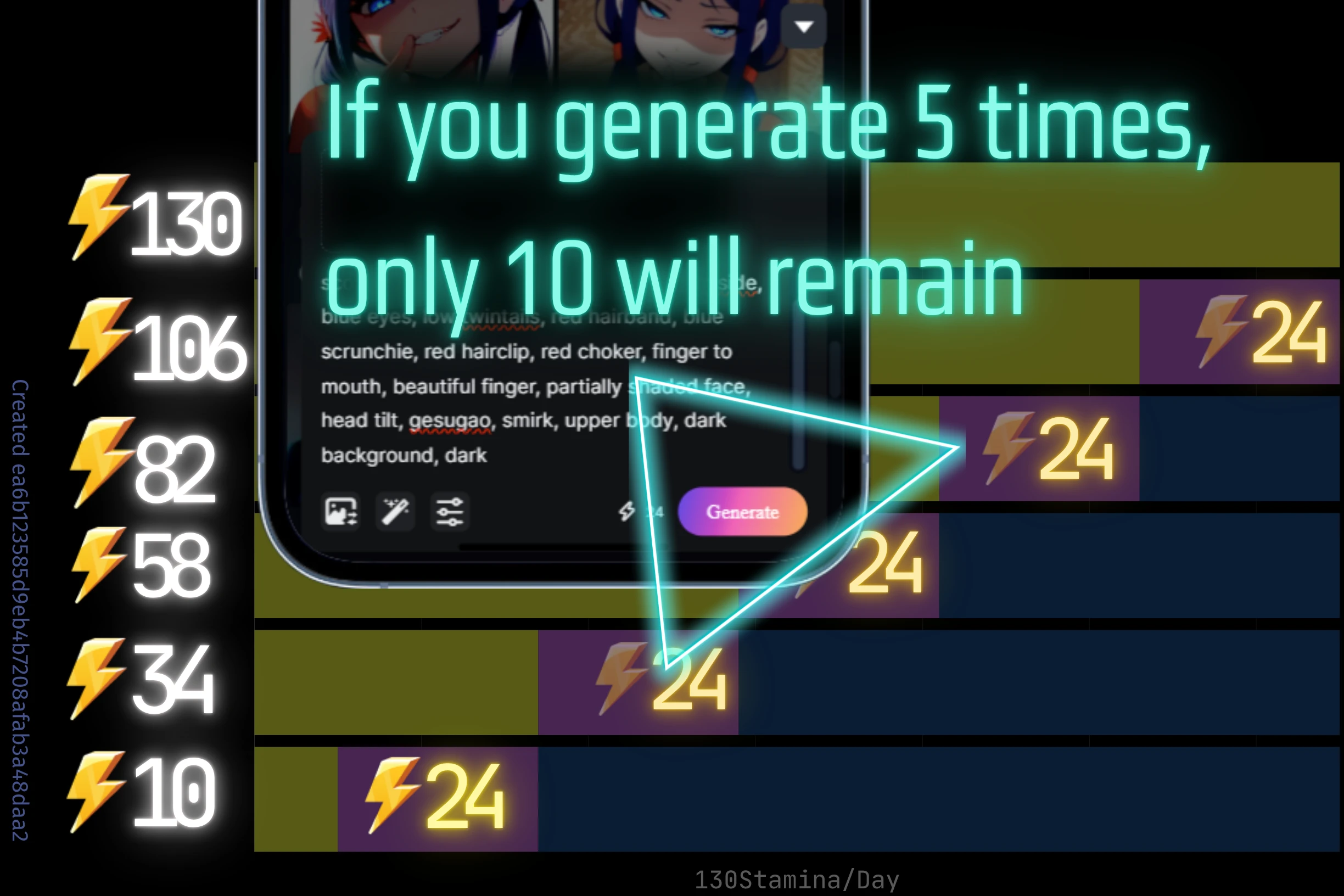 When generated at 9:16, each image consumes 6 Stamina. Generating four images costs 24 Stamina.