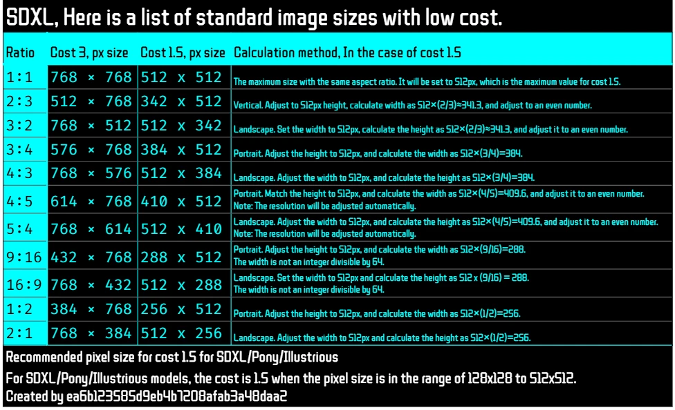For information on 1:1, 1024px, and the official SDXL recommended values, please refer to the following items.