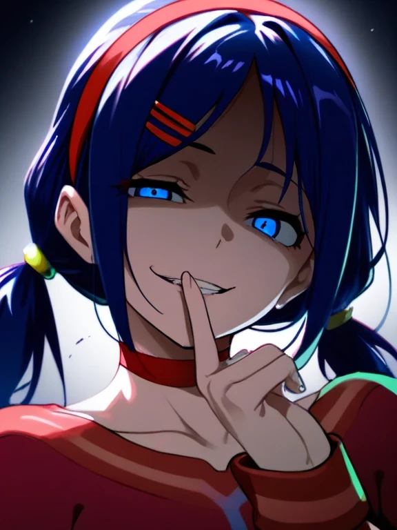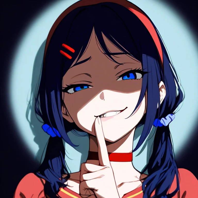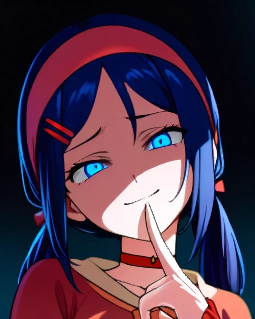 Prompt word:(masterpiece, best quality, high score, great score), absurdres, 1girl, mita \(miside\), miside, blue eyes, low twintails, red hairband, blue scrunchie, red hairclip, red choker, finger to mouth, beautiful finger, partially shaded face, head tilt, gesugao, smirk, upper body, dark background, dark