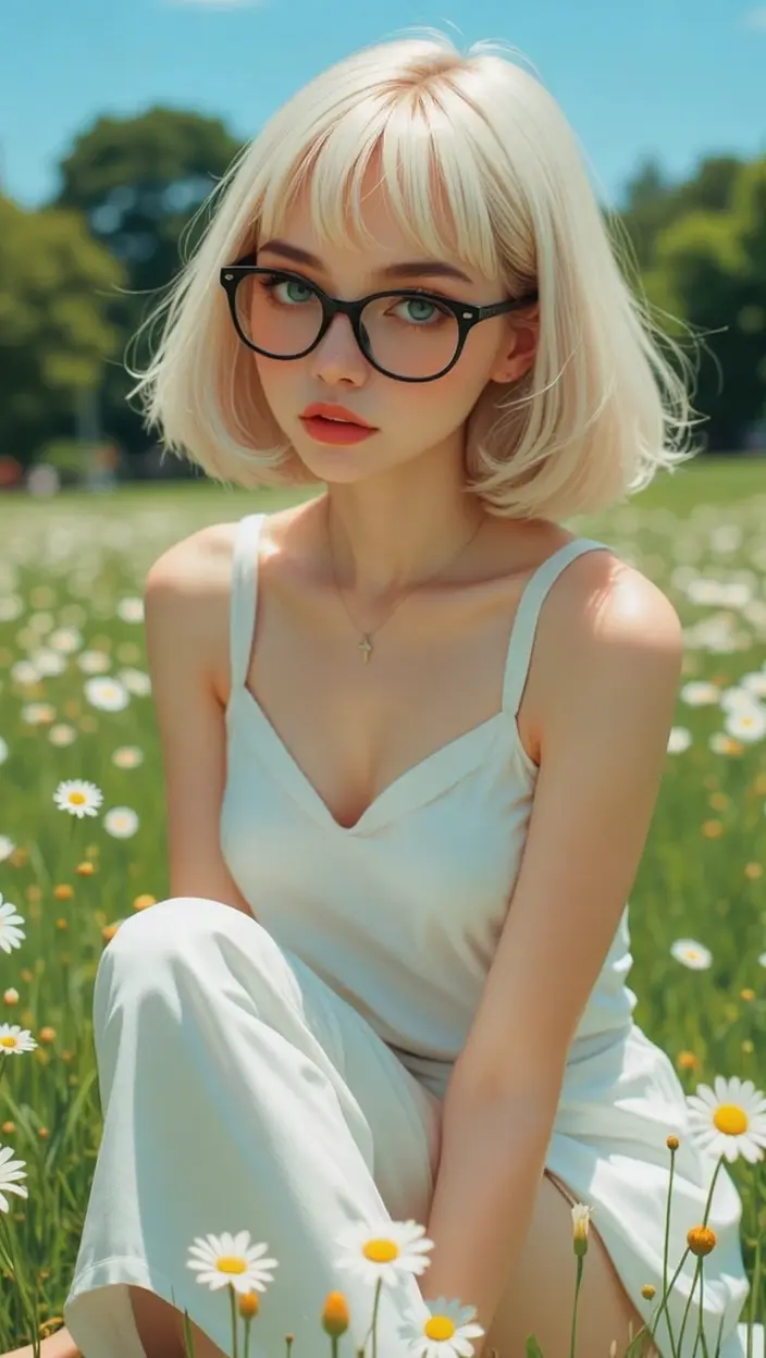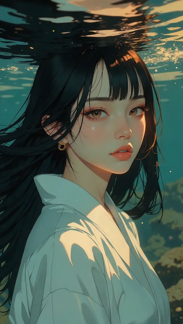 she emerges from the water, camera following her to the surface, the sky is blue, illustration style