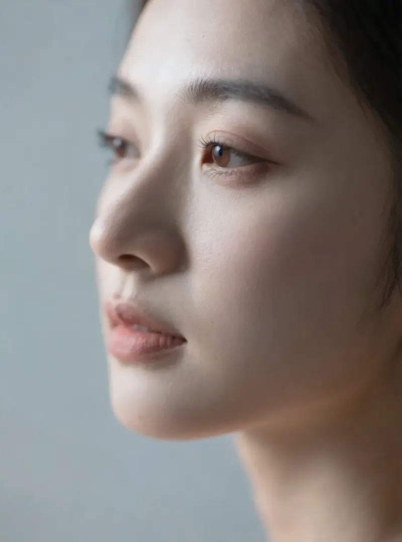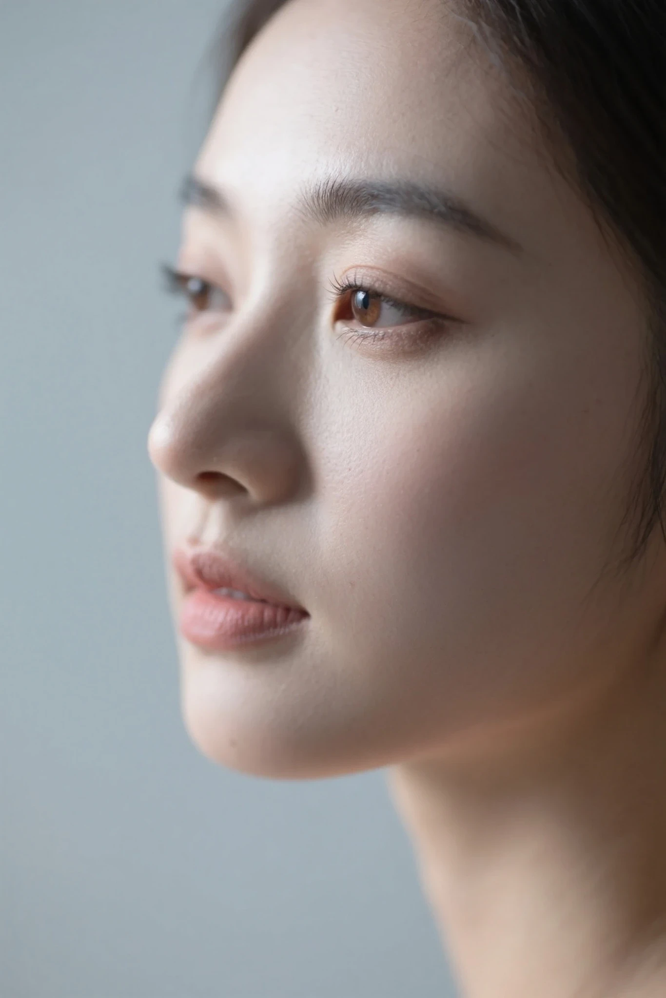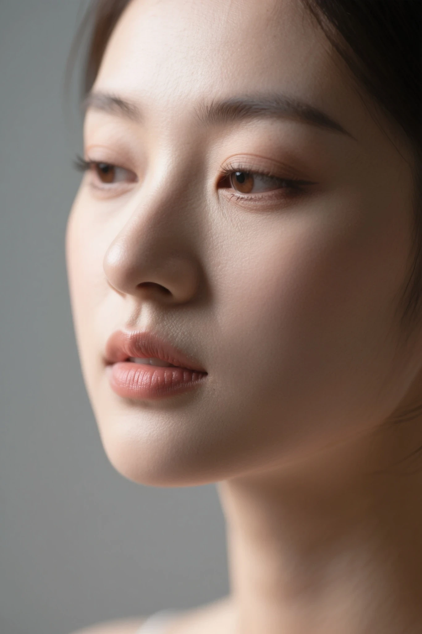ultra realistic close-up portrait of a young woman, sharp facial features, realistic skin pores, eyelash detail, soft diffused light, studio photography style, high resolution, photo-realistic, bokeh background