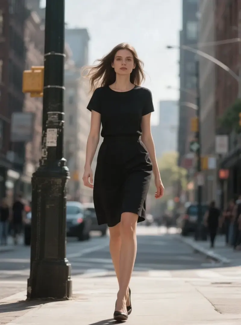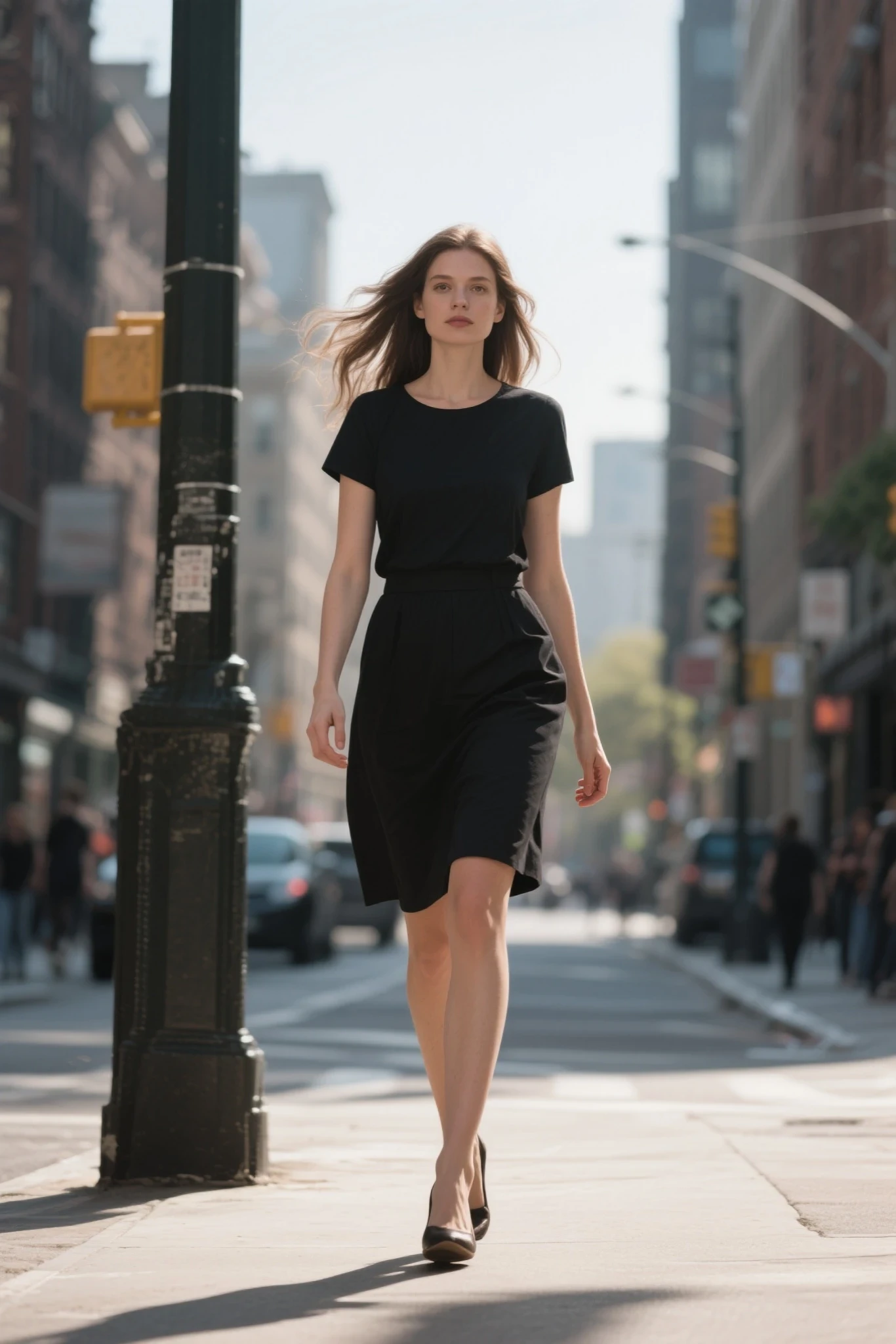 • Shot 1 (Long shot, camera push-in): Action: Model walks slowly from a distance with a calm, steady pace. Arms swing naturally; skirt sways rhythmically. Camera: Slightly stabilized push-in from wide to medium shot, enhancing entrance. Atmosphere: Warm sunlight, layered urban background, subtle ambient contrast.