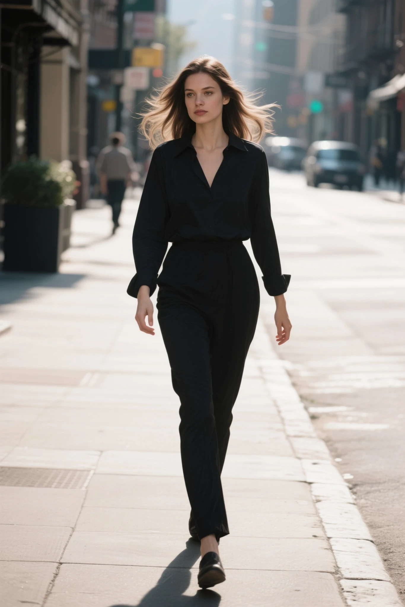 • Shot 2 (Mid-shot, horizontal dolly): Action: Side profile as she walks left to right. Hair moves gently in the breeze; body moves fluidly with upright posture. Camera: Tracking shot with smooth dolly at her pace. Effect: Background motion blur (traffic, lights, pedestrians) enhances realism.