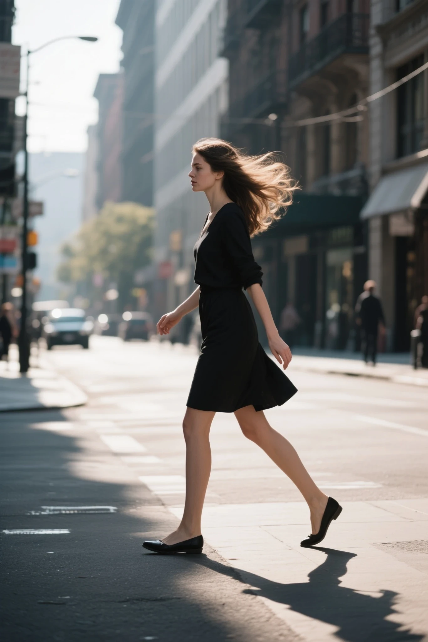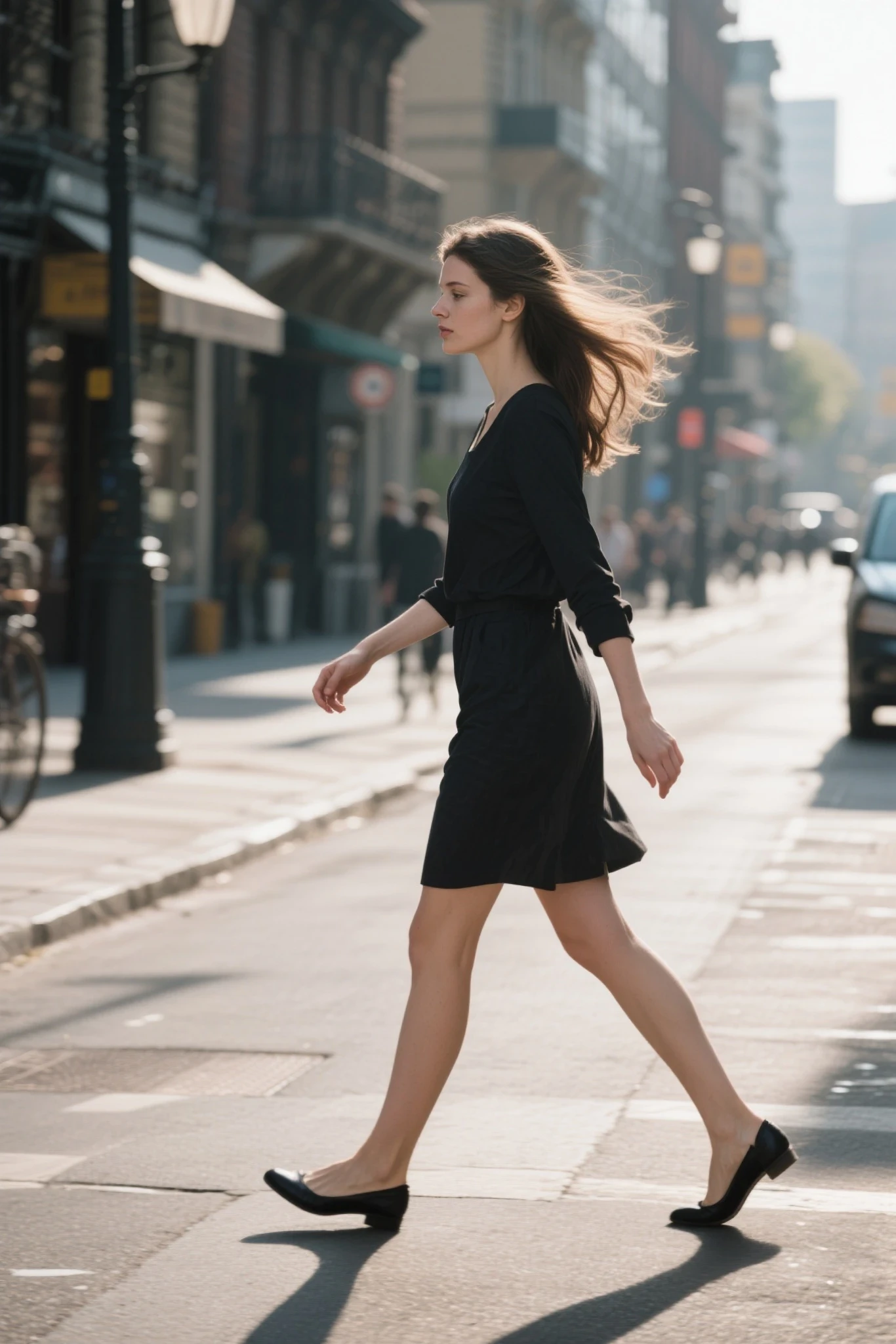 • Shot 3 (Low-angle follow shot): Action: Close-up on her heels walking across a crosswalk—each step with strength and rhythm. Camera: Low-angle upward shot slowly rising, slight handheld movement matches her pace. Texture: Reflective sunlight on pavement and shadow interplay adds tension.