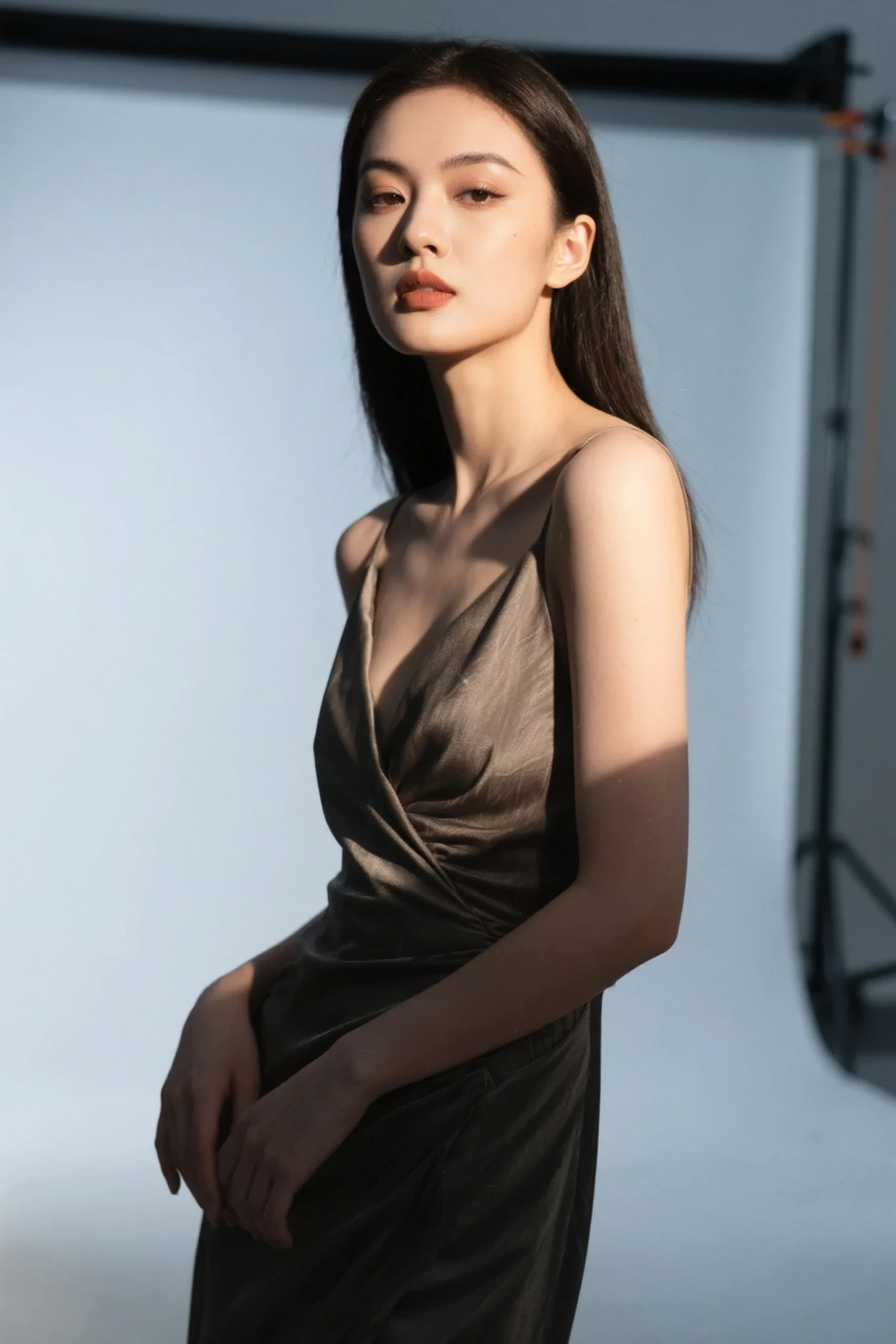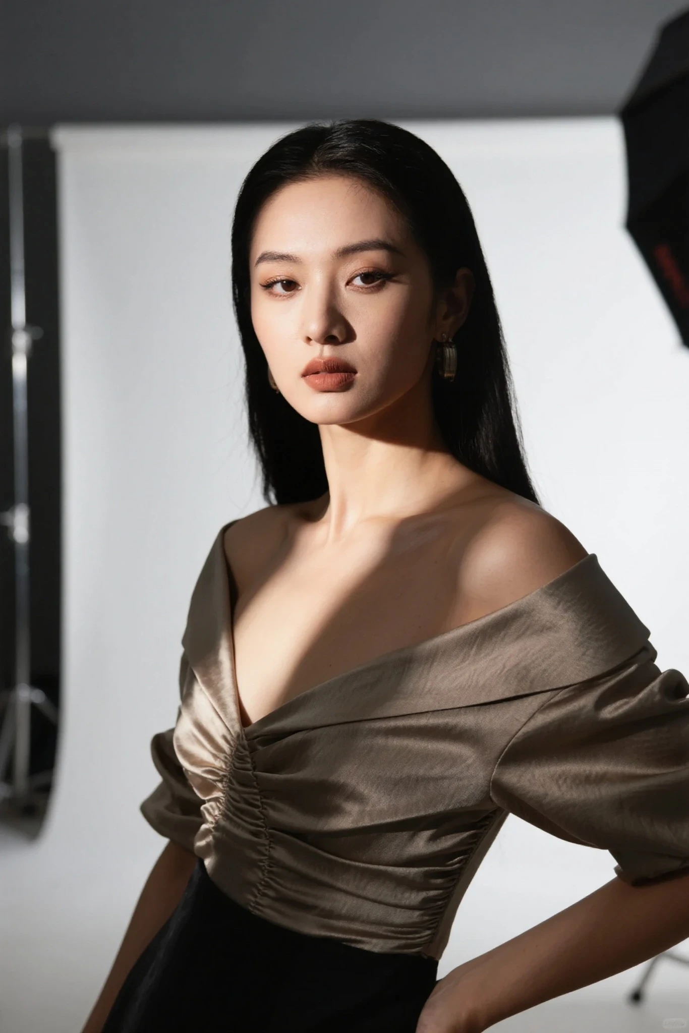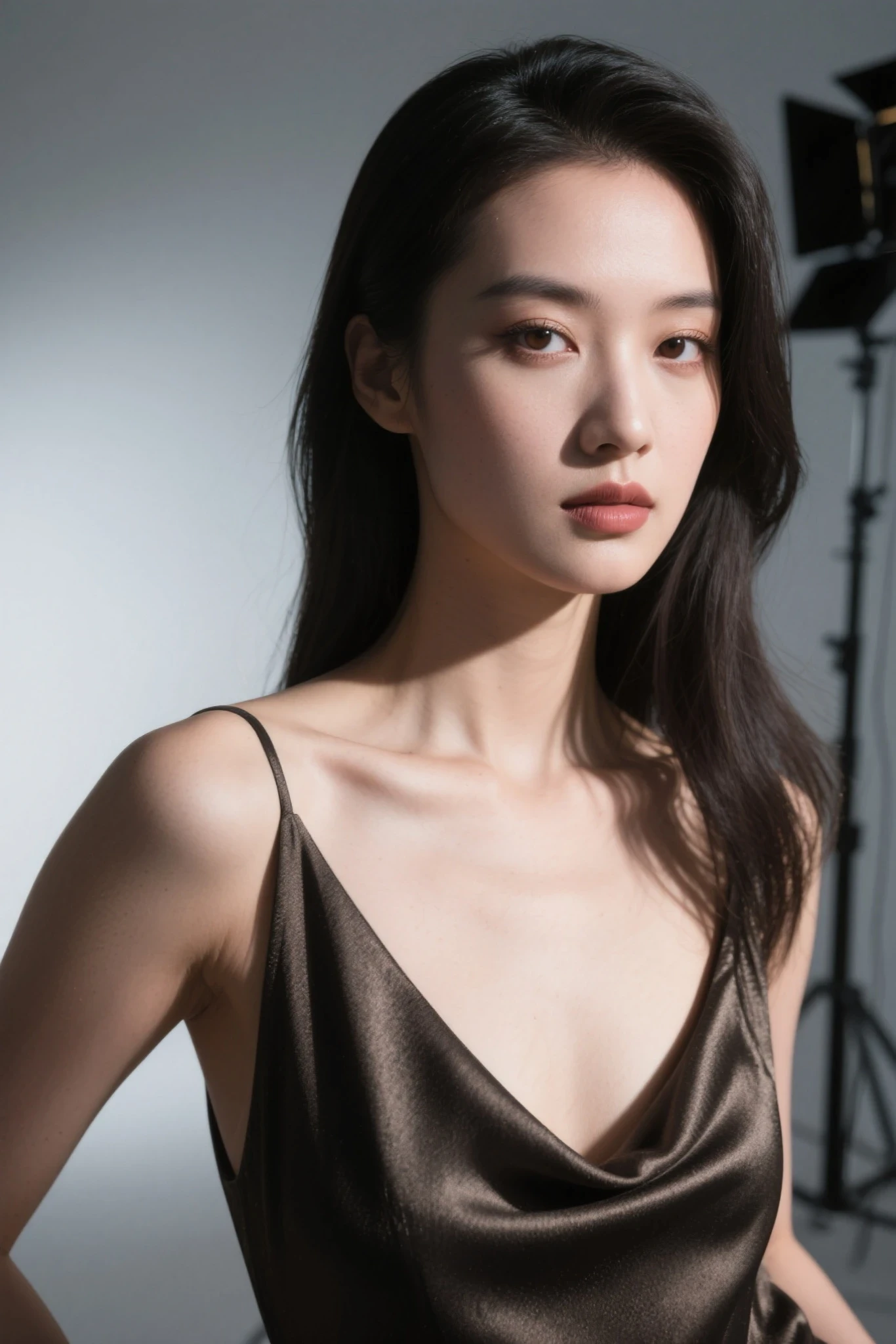 Prompt:fashion photo of a stylish woman, posed in studio, realistic lighting, high-detail makeup, textured fabric clothing, 85mm portrait style, natural shadows, photo-realistic, ultra detail, 8k