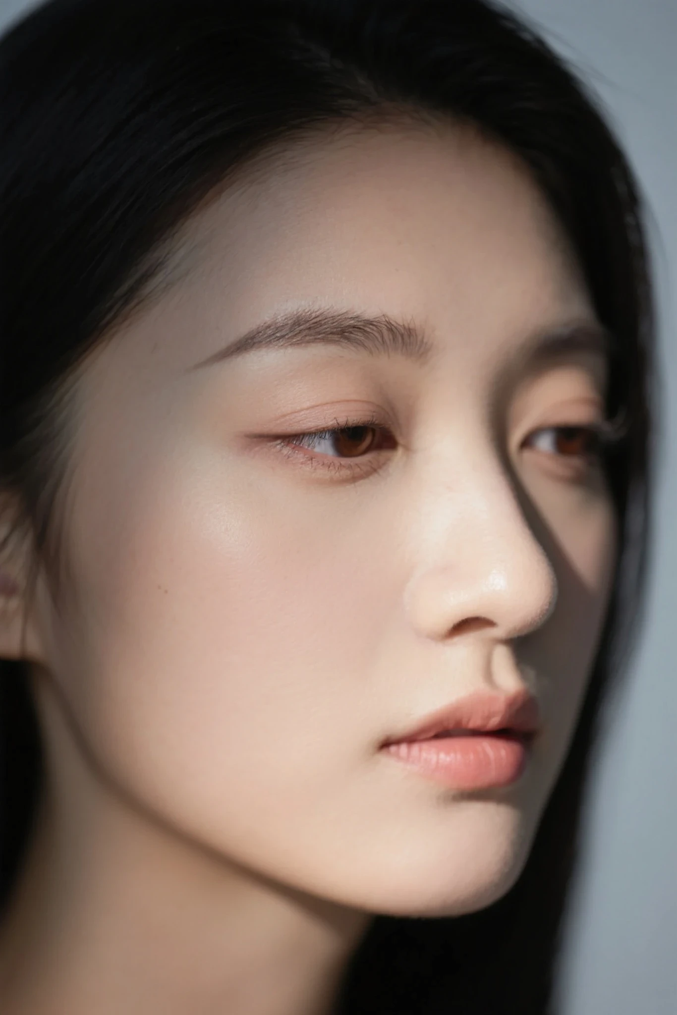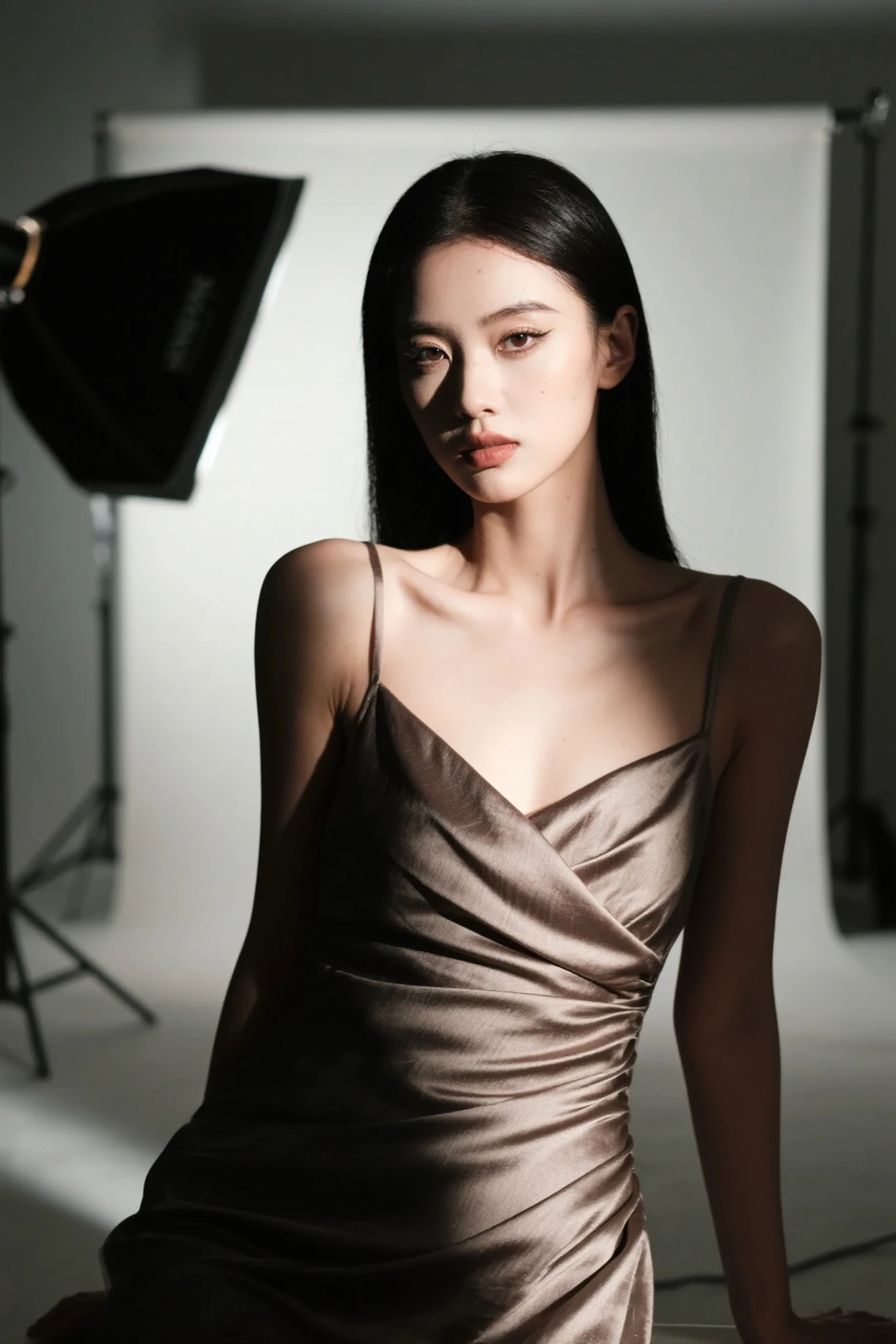 Masterpiece-level picture quality, 8K ultra-realistic, studio portrait cinematic, skin texture optimization, ultra-fine focus, zero distortion. A stunning East Asian woman with delicate facial features and moist skin. Wearing an off-white silk shirt, sitting on the ground against a white seamless curtain. The professional three-point cloth illuminates her perfectly symmetrical face, with subtle highlights jumping between her hair. The eyes are gentle and intellectual, and the eyes are naturally moist and reflective.
