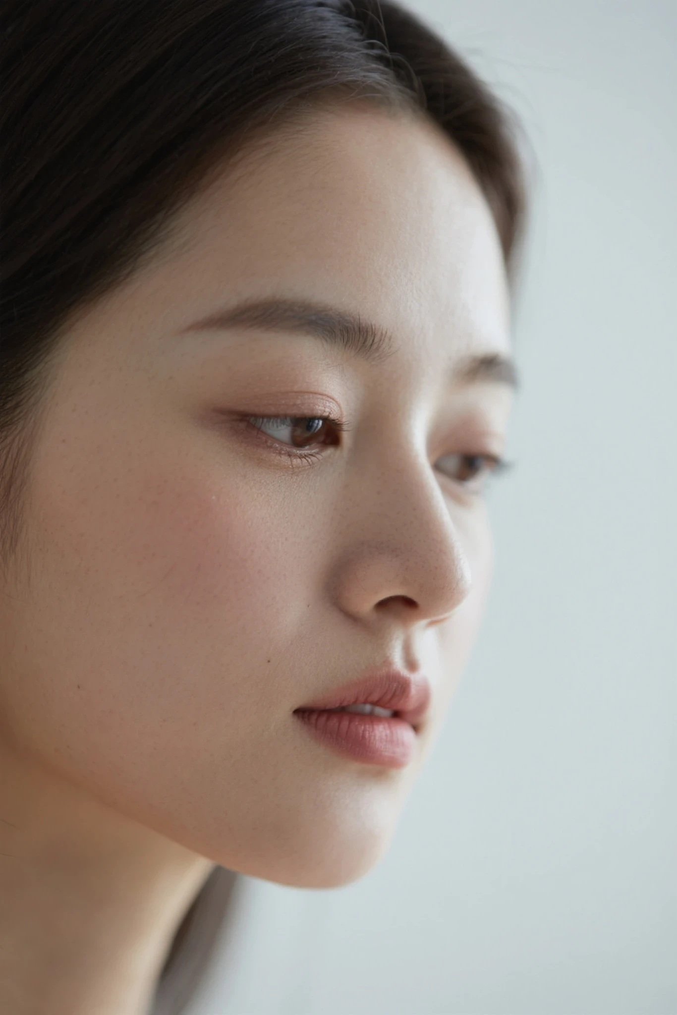 Realistic portrait of a young woman in a studio, with delicate facial features and clear composition.