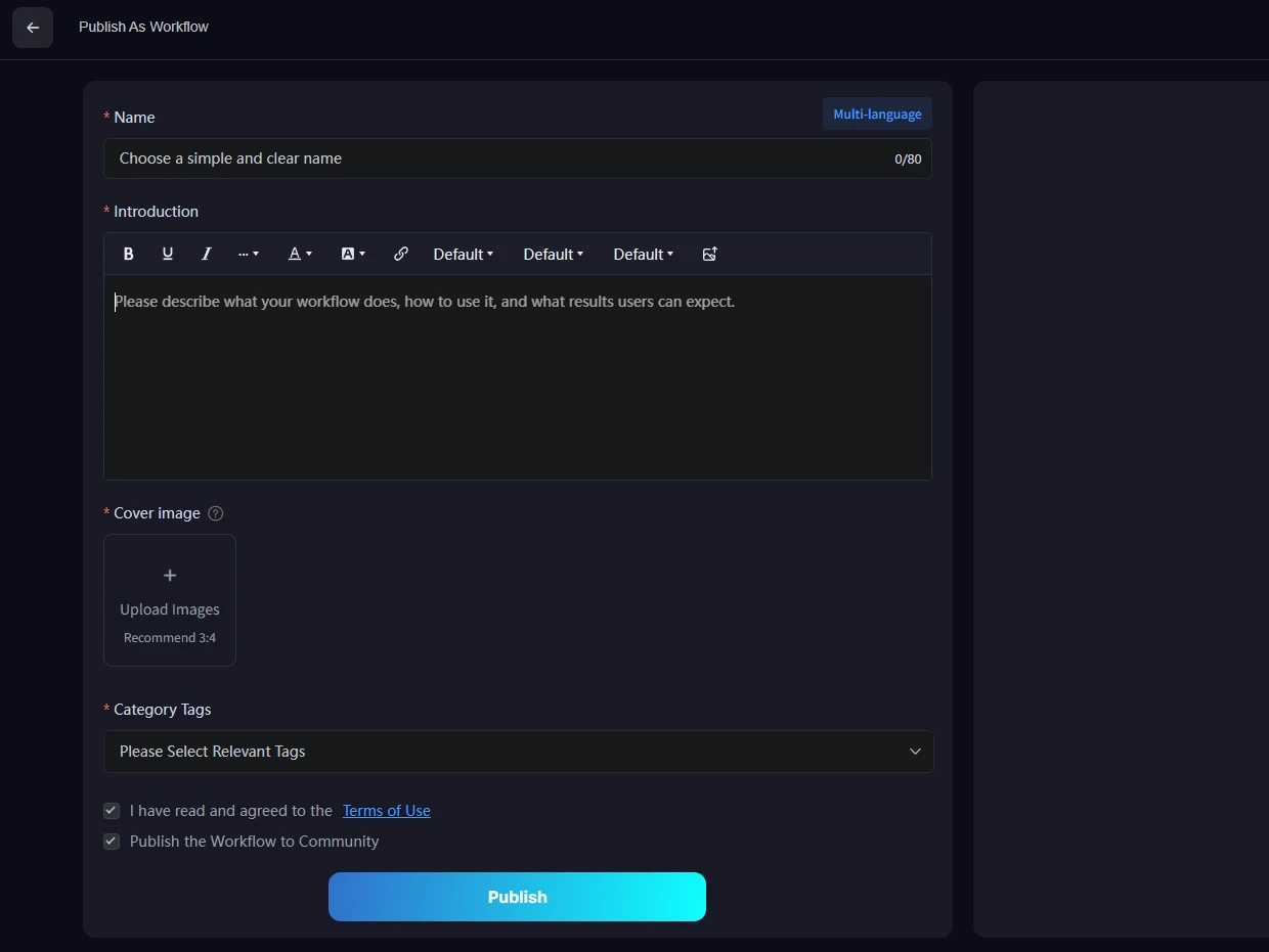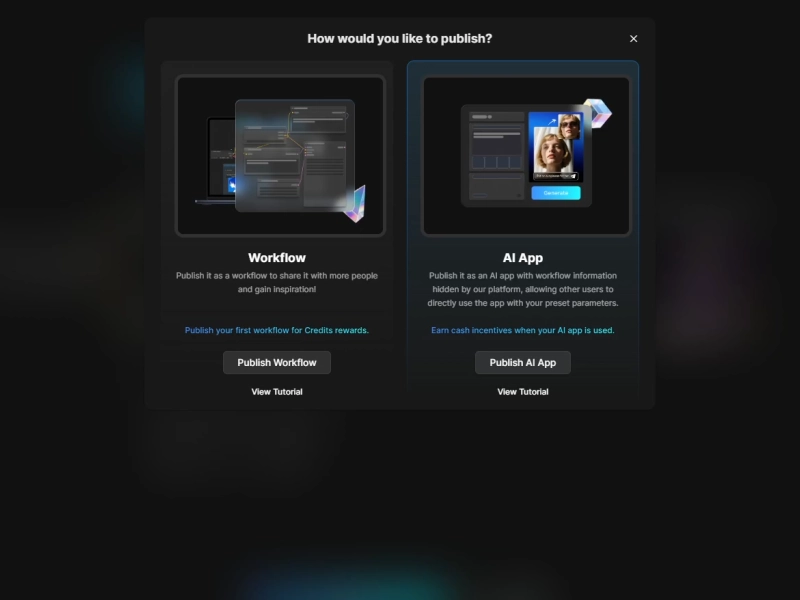 📝 Note: The AI App publishing option will be explained in detail in the AI App publishing tutorial. This tutorial focuses on workflow publishing.