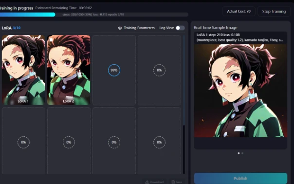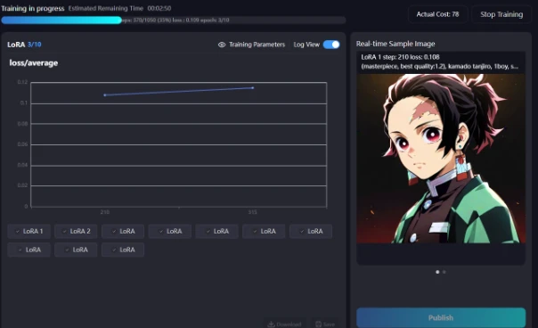 This shows the latest preview image being generated in the current step. When this Epoch is completed, this image will be stored in the "results wall" on the left. Now, through the above monitoring, you may feel that Epochs 6-8 look good. But don't rush to conclusions! Small preview images can't tell the whole story. The real test begins after training is complete! (If you're already experienced or have lower requirements, simply choose the LoRA you're satisfied with, save, and publish it. If you need further judgment, save several of the better ones first.)