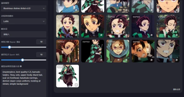 Function: These are the character's core feature words. Including these in the preview allows you to directly check how well the model has learned Tanjiro's most important features (black hair, forehead scar, hanafuda earrings, demon slayer uniform). If these are consistently reproduced, it indicates the model is training well.