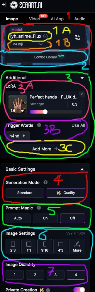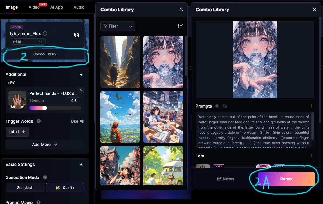After you clicked the Combo Library (marked by number 2) , you can choose one featured image to generate with the exact same settings and prompt by clicking Remix (marked by number 2A)