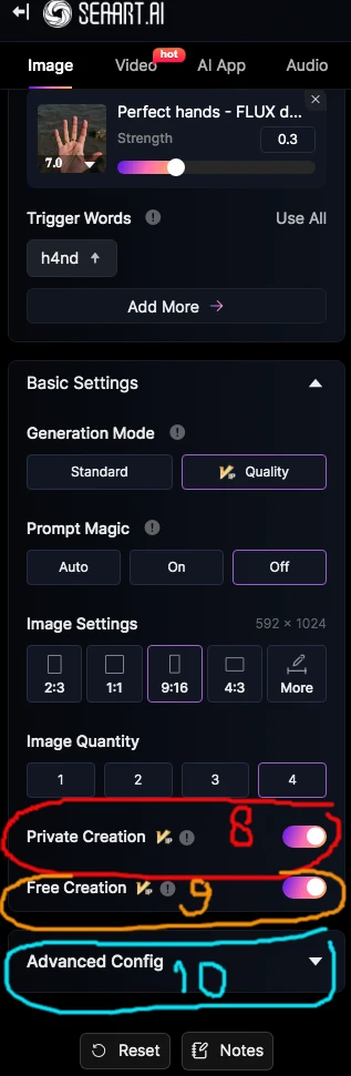 Private creation, if switched on, enables you to create image(s) without showing it to the public. This is a feature only available for SeaArt subscribers.