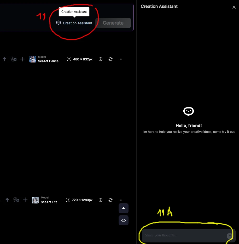 Click at Creative Assistant which located near the generate button to open a chat menu (marked by number 11) . Then type in some words at the Share your thoughts area (marked by number 11 A)
