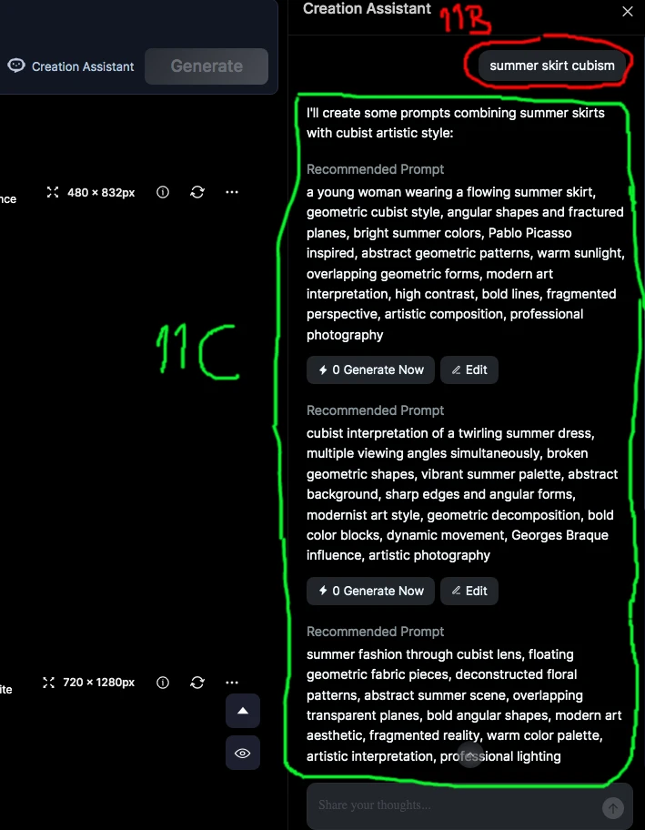 You can see my input summer skirt cubism above. (marked by number 11 B) and the result (marked by number 11 C)  The creative assistant gave me 4 prompts and I could click Generate Now or Edit under the resulting prompt.  Generate Now to generate image(s) using the prompt and my settings previously or Edit to edit the selected prompt.