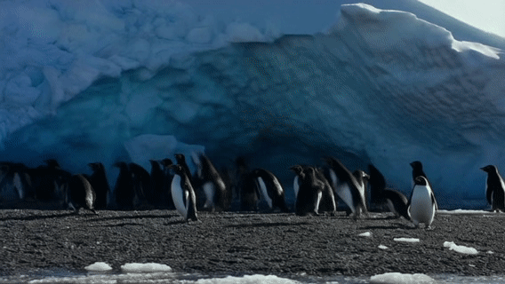 Prompt: colony of penguins, sprinting & leaping over cracking ice, fast side-follow tracking cam, ice-shelf explosions, debris spray, icy arctic blue daylight