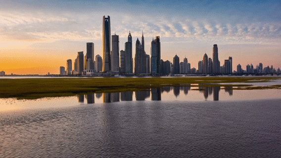 Prompt: coastal marshland sunrise, terrain evolving into modern Mumbai skyline, crane-up + tilt transition, fast city-build timelapse, cloud-warp, golden-hour to neon-city grade